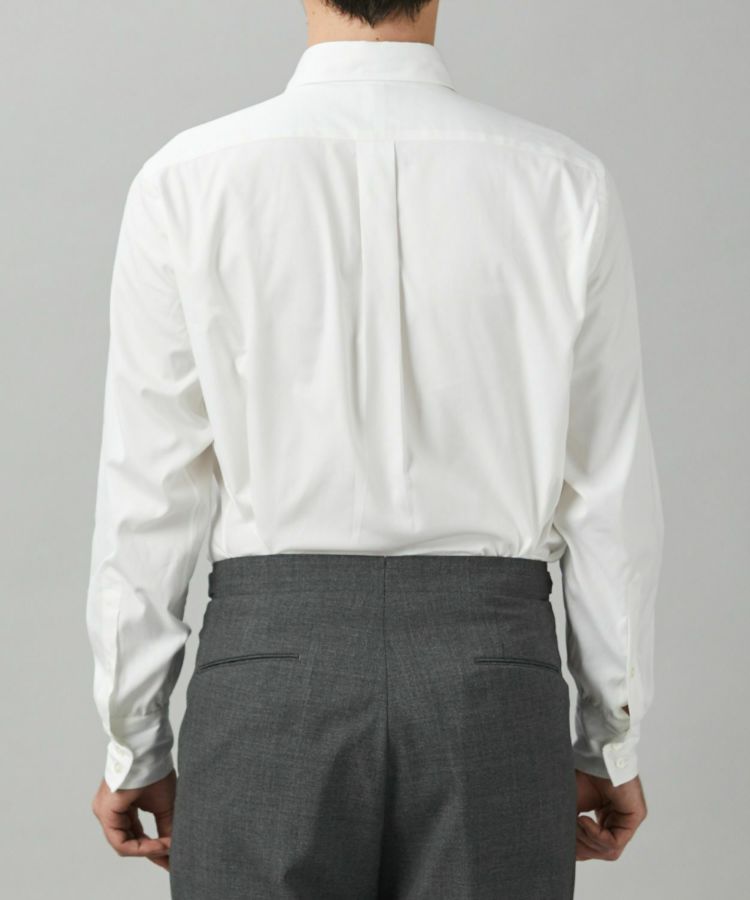 今回、新たに加わるのはオックスフォード生地の一種である「ピンポイントオックス」(通称ピンオックス)を使用したホワイトの1着。通常のオックスフォードよりも細番手のコットンを使って織られているため、シルクのような肌ざわりと光沢感があります。適度なハリ感や通気性を備えており、一年を通して使いやすいのが特徴です。