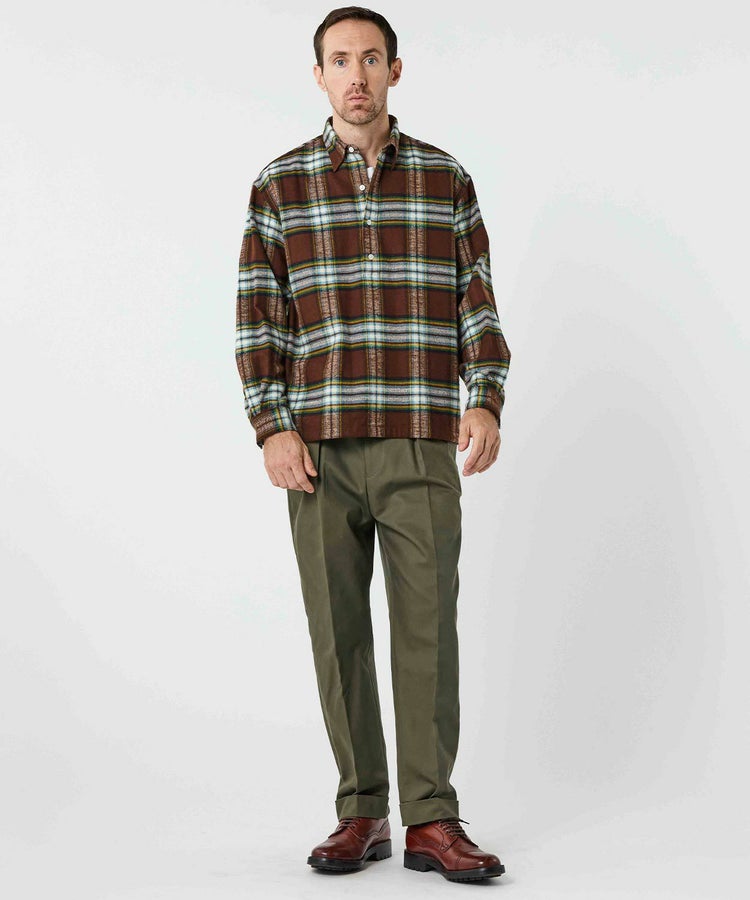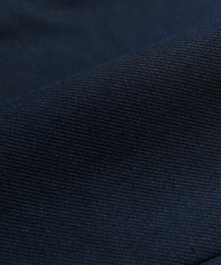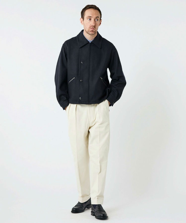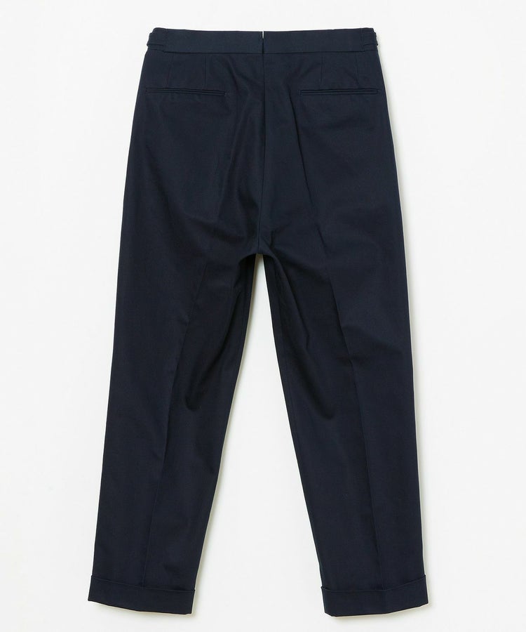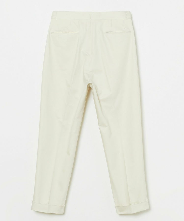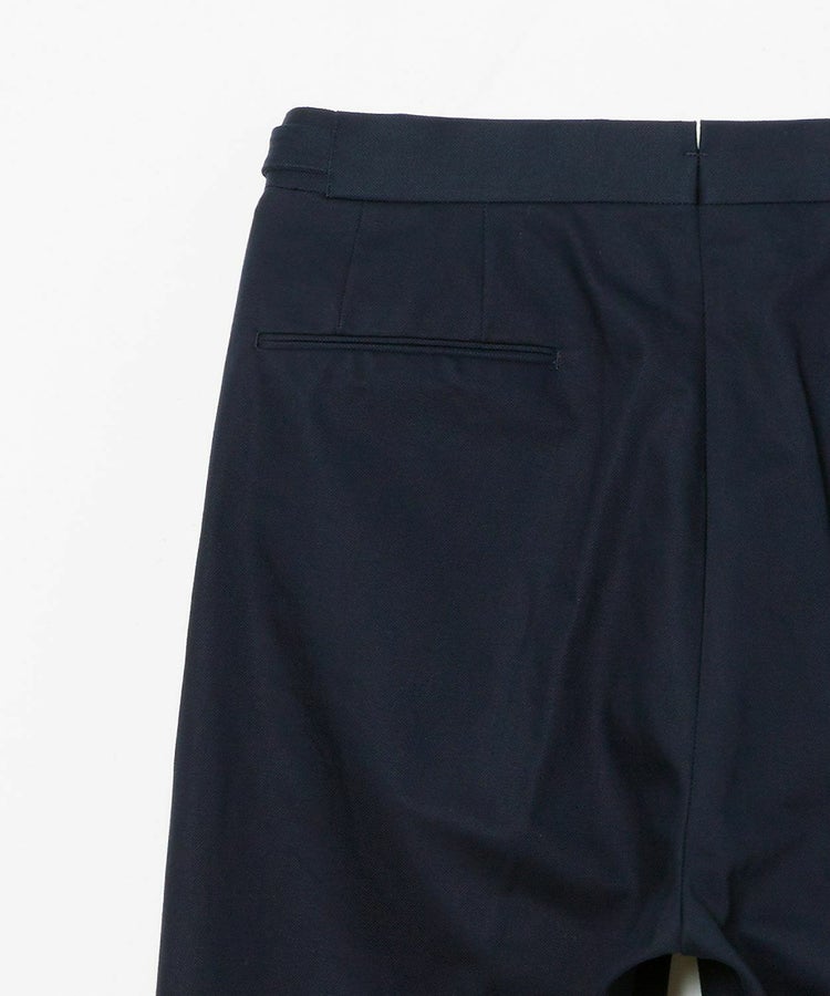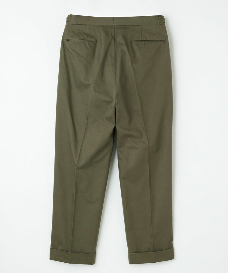 従来のモデルから持ち出しの長さと先の形状を全体のバランスを考慮しアップデート。イメージソースとしたのは1960年代のロイヤルネイビー(英国海軍)のホワイトドリルトラウザーズ。ベルトループが無い“ベルトレス”で穿くクラシックなディテールで英国らしい上品さが魅力の一つ。サイドアジャスターはバックル調整ではなく、ボタン調整になっております。本来のシルエットよりも膝と裾巾を細くしテーパード感をやや強めたオリジナルバランス。パターンに振り込みを入れて、真っ直ぐ立った時に、キレイにストンと落ちるよう工夫を入れ立ち姿の美しいシルエットにも拘りました。ヒップサイドの脇線は真っ直ぐではなくカーブを強くし、もたつかないようフィットするデザインに。またマーベルト(※)仕様のためシャツをタックインした際にズリ上がり難くなっております。オンオフがシームレス化する今のライフスタイルに最適なパンツです。