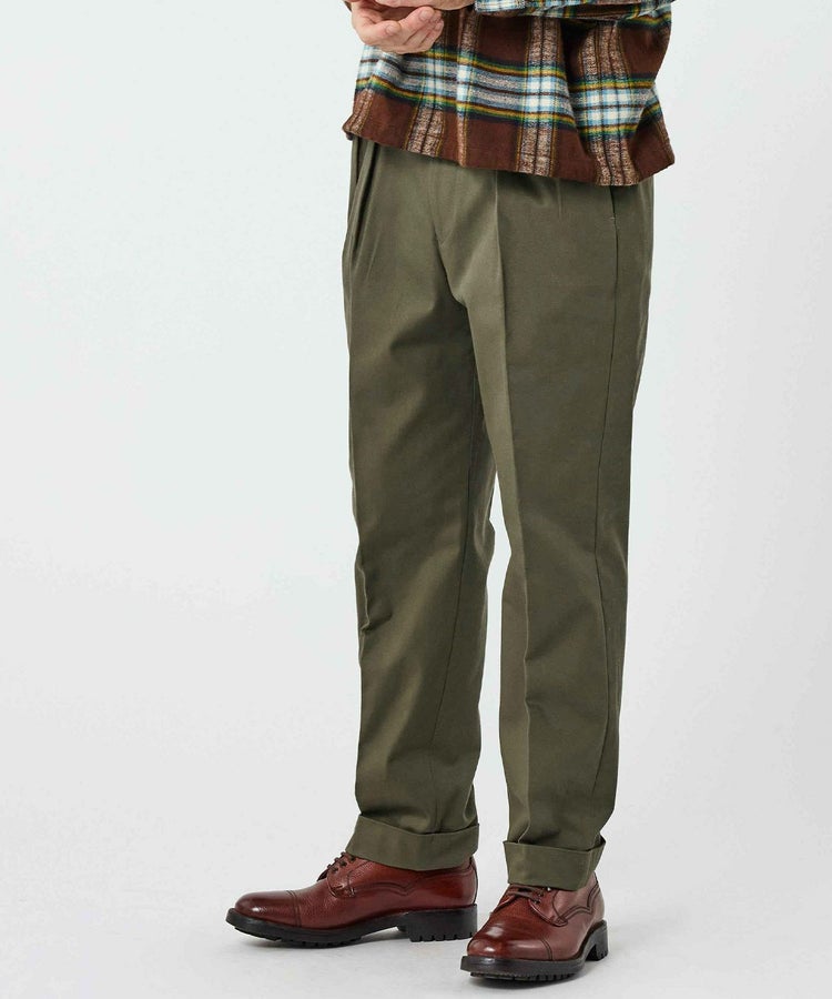 イギリスはもちろん様々な国のヴィンテージミリタリーウェアによく採用されているコットンドリル生地。今回のアイテムに使用した生地は、ヴィンテージのチノパンを分析して忠実に再現した日本製の生地を使用しています。太番手の糸をざっくりと打ち込むことでヴィンテージ感を演出しつつも、生地の光沢感や綾目の表情により上品さもある生地です。経年変化も期待できるため、自身で穿きこみながら育てていく楽しさも味わえます。
