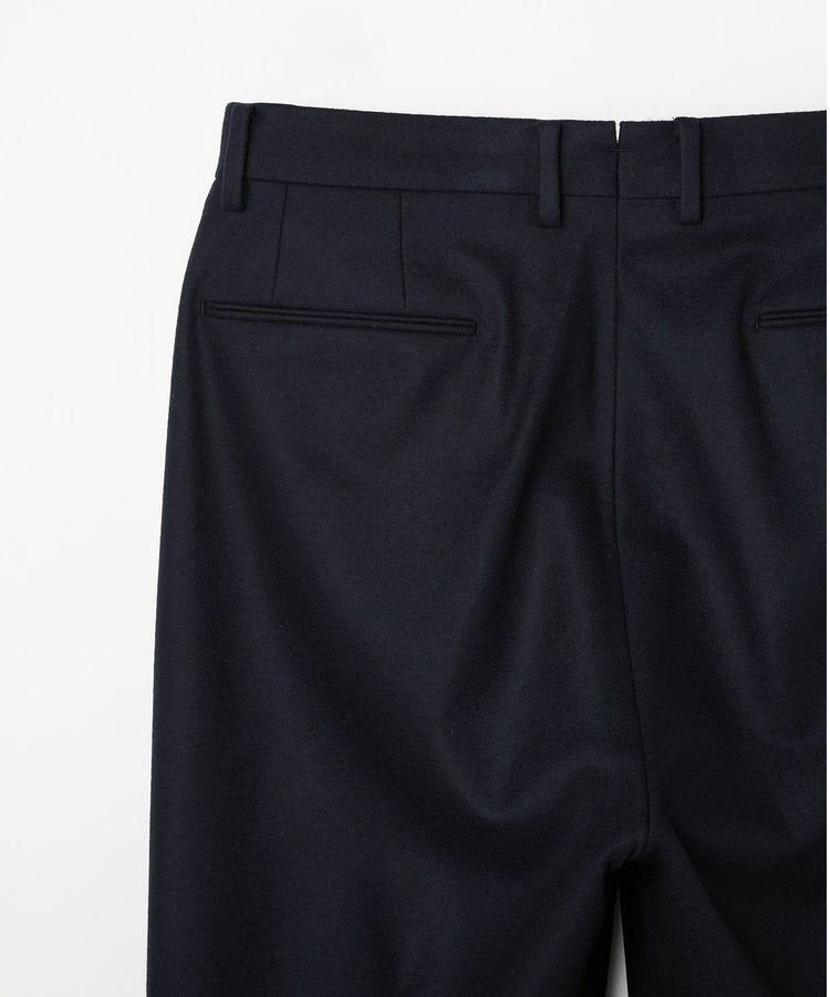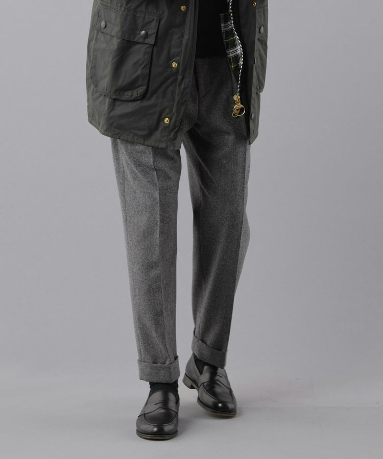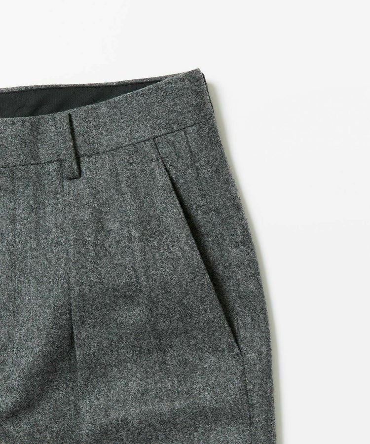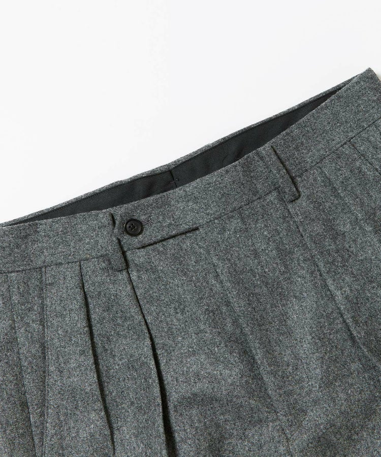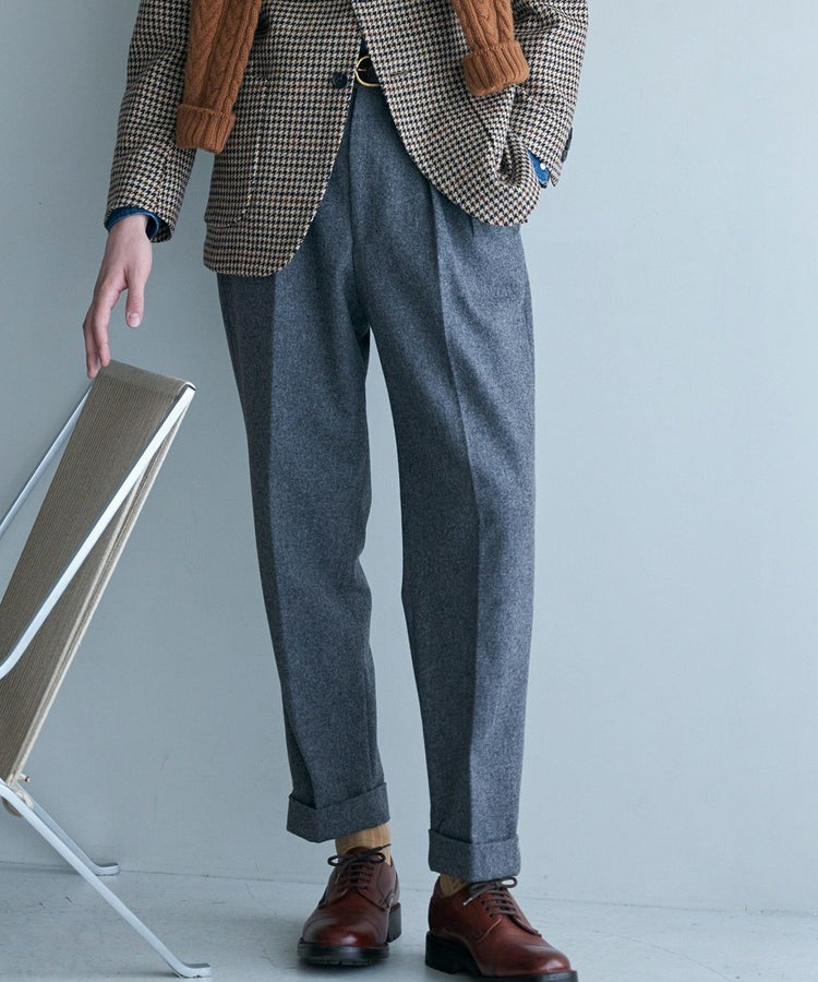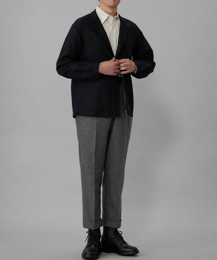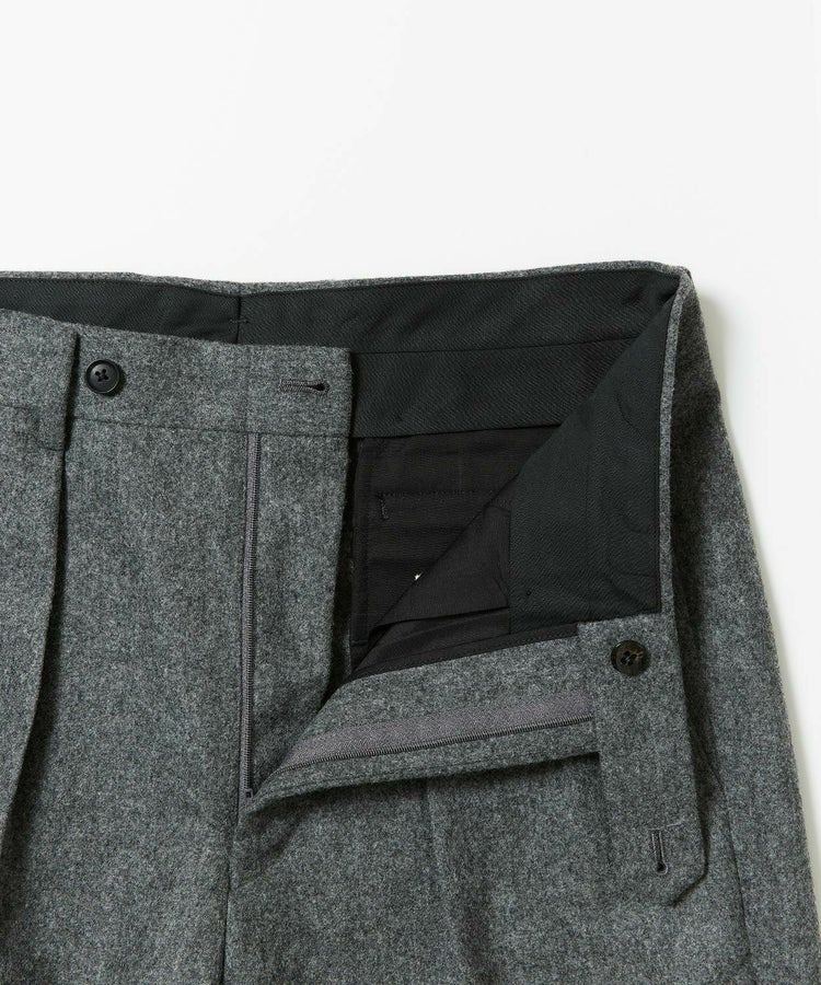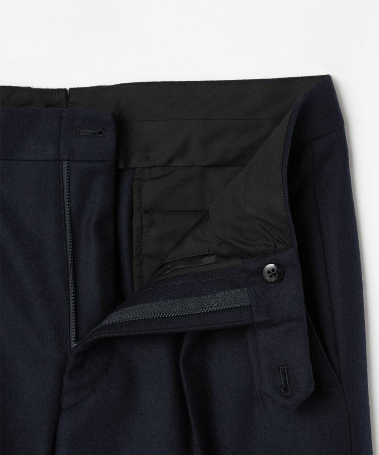 良質なメリノウールでヴァージンウール100%の原毛を使用。オーストラリアンメリノウール100%の生地は本当に今は貴重です。ナイロンを入れる意味合いとしては縮絨の工程を行いやすくする為。本来フランネルという生地は10番単糸や12番単糸の紡毛糸で作製するのですが、この生地は細番紡毛糸16番単糸を使用しています。フランネルは何度も縮絨を繰り返し作製。現在ではこの工程を省いてしまっているものもフランネルとして出回っているものがありますが、オフィサーパンツの生地は縮絨を何度も行い、本来のフランネル生地を工程を得て作られています。また10番単糸で作製すると旧態依然〈1990‘Sそのまま〉の生地になってしまうので16単糸を使用し膨らみ、柔軟性、光沢感を持たせ高級感のある素材に仕上げています。