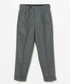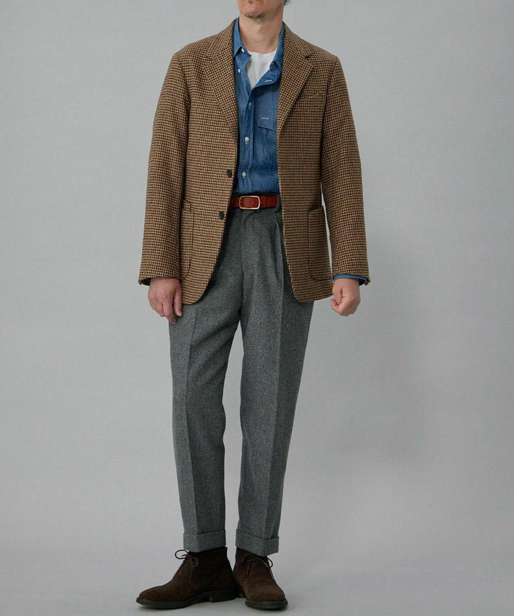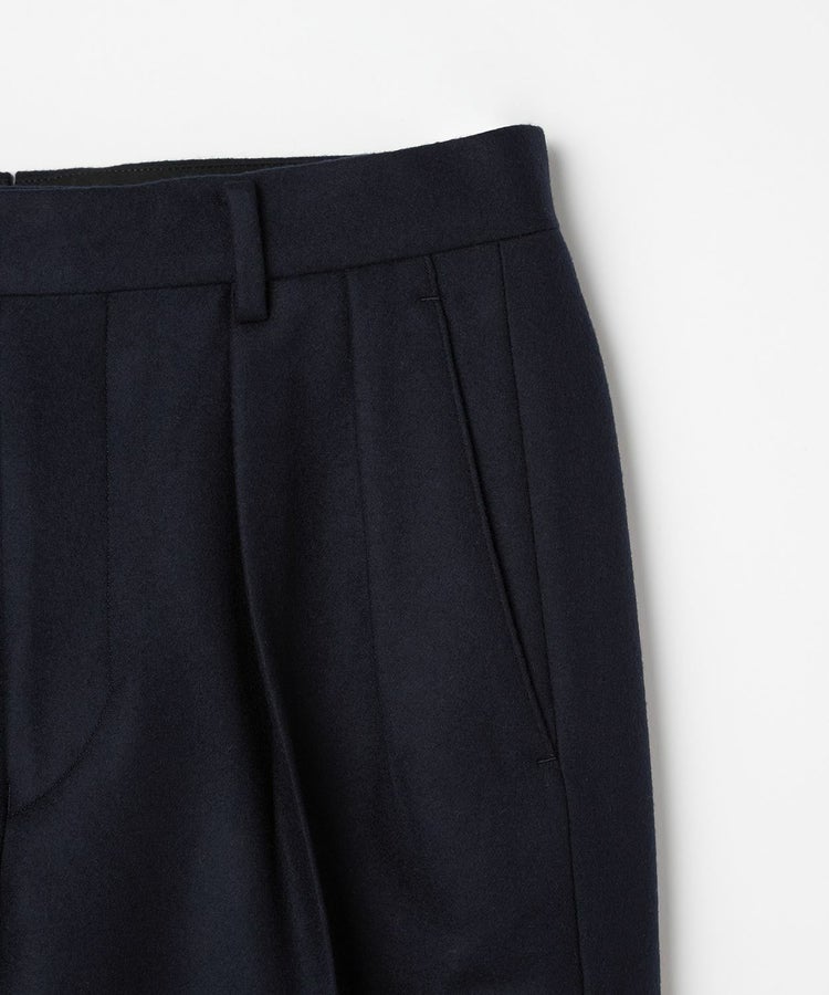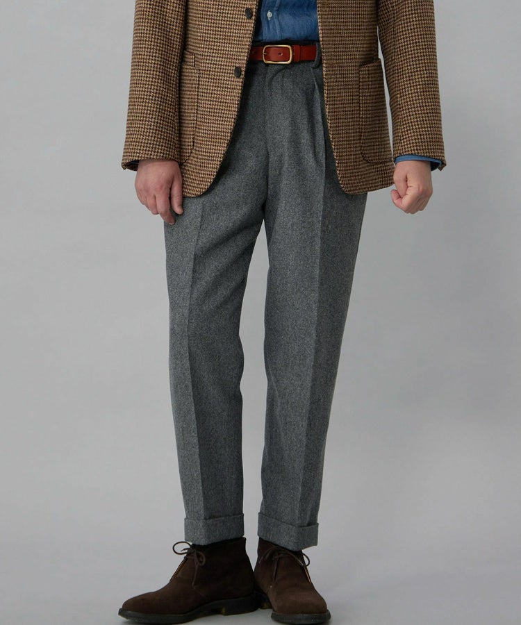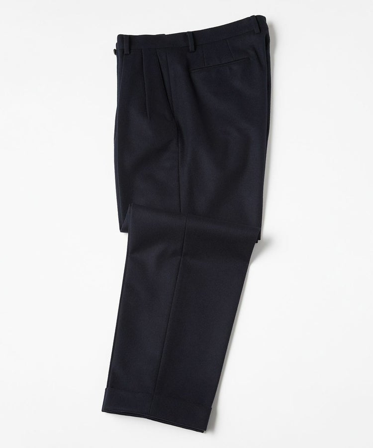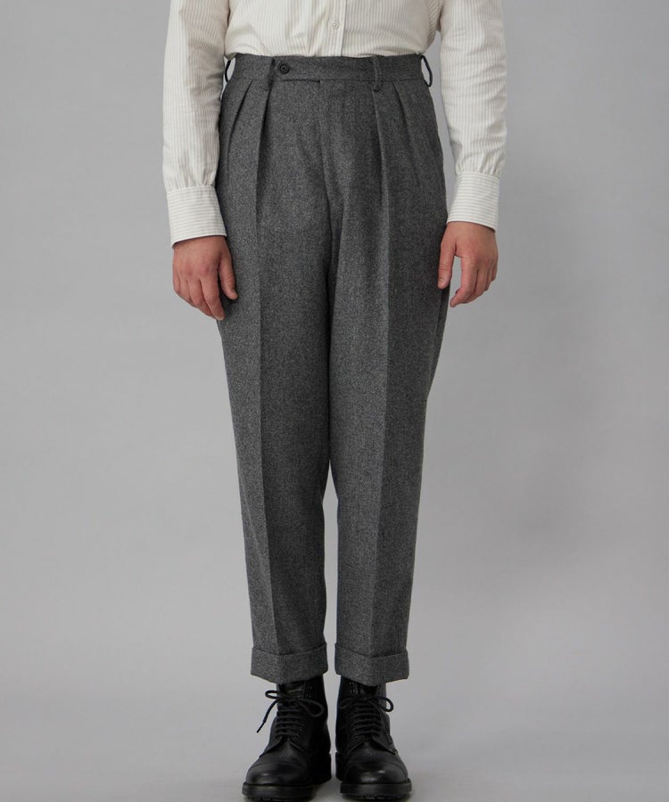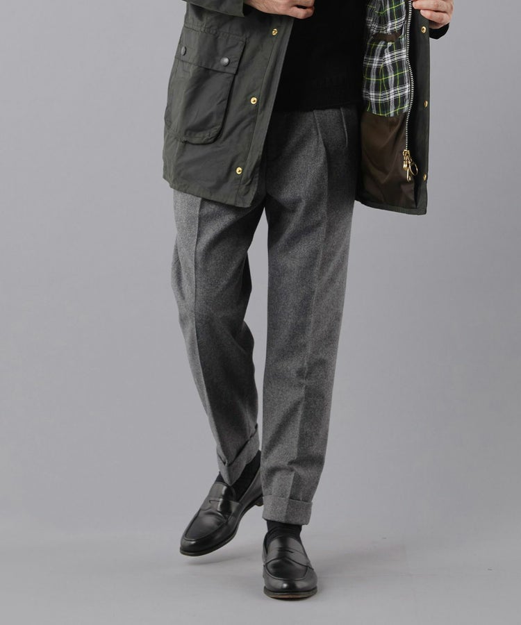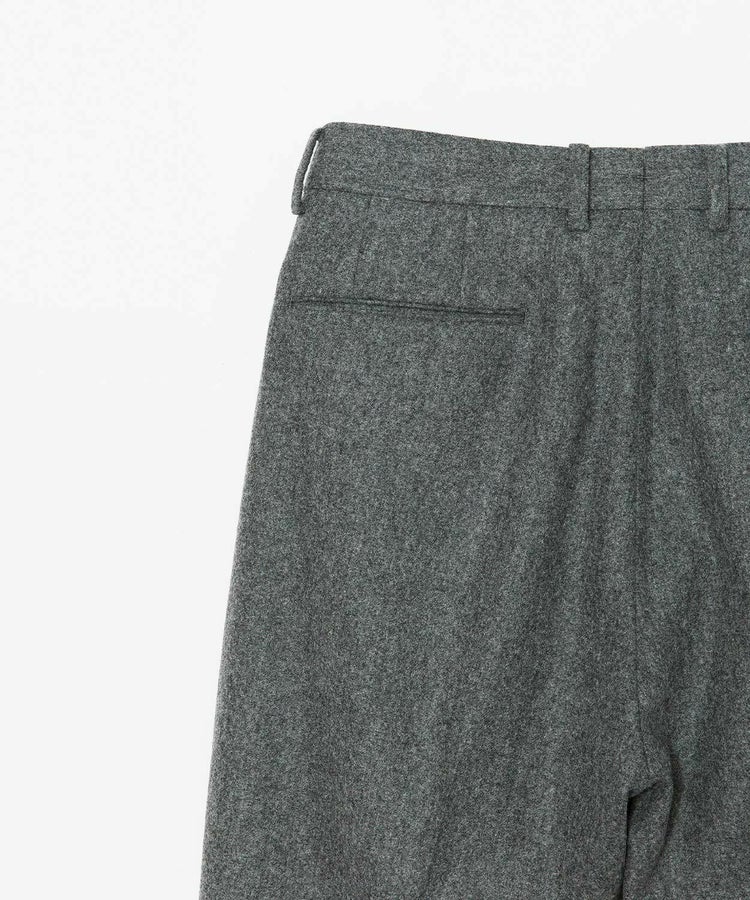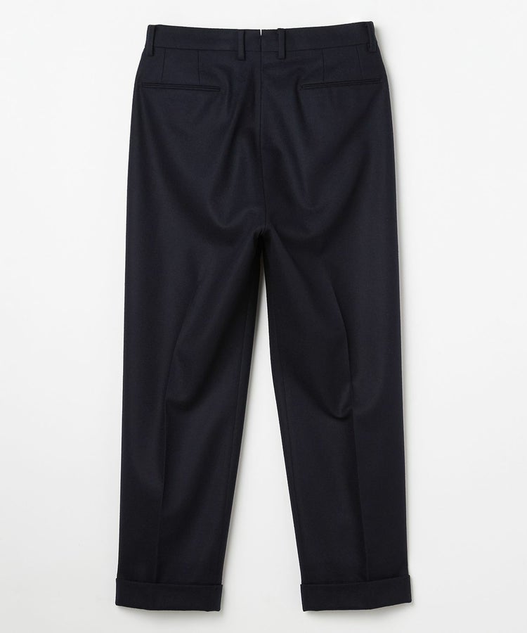 良質なメリノウールでヴァージンウール100%の原毛を使用。オーストラリアンメリノウール100%の生地は本当に今は貴重です。ナイロンを入れる意味合いとしては縮絨の工程を行いやすくする為。本来フランネルという生地は10番単糸や12番単糸の紡毛糸で作製するのですが、この生地は細番紡毛糸16番単糸を使用しています。フランネルは何度も縮絨を繰り返し作製。現在ではこの工程を省いてしまっているものもフランネルとして出回っているものがありますが、オフィサーパンツの生地は縮絨を何度も行い、本来のフランネル生地を工程を得て作られています。また10番単糸で作製すると旧態依然〈1990‘Sそのまま〉の生地になってしまうので16単糸を使用し膨らみ、柔軟性、光沢感を持たせ高級感のある素材に仕上げています。