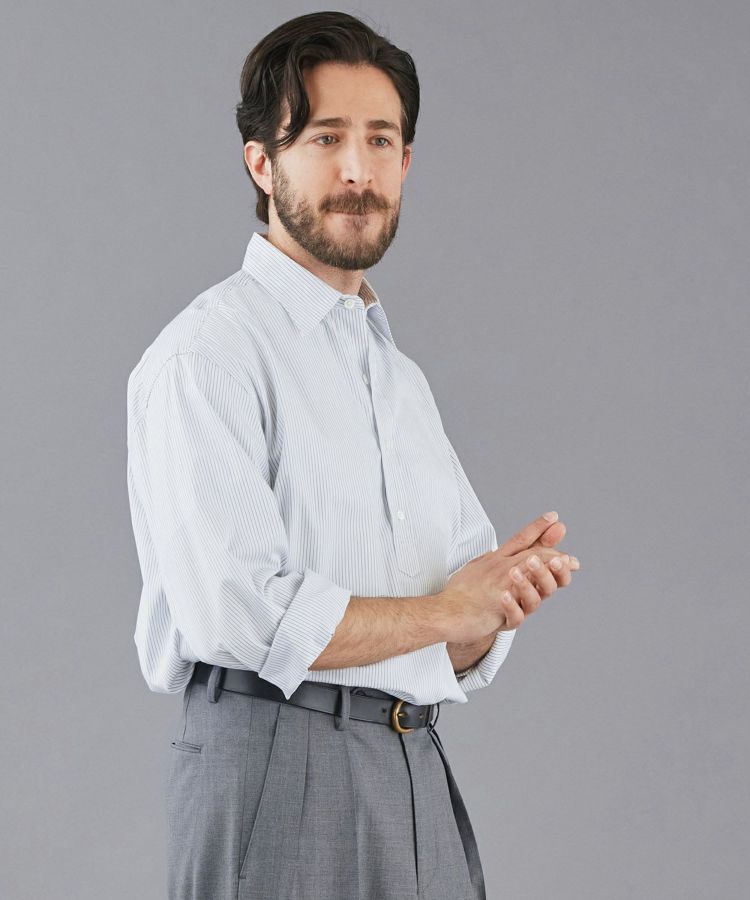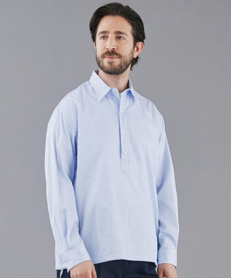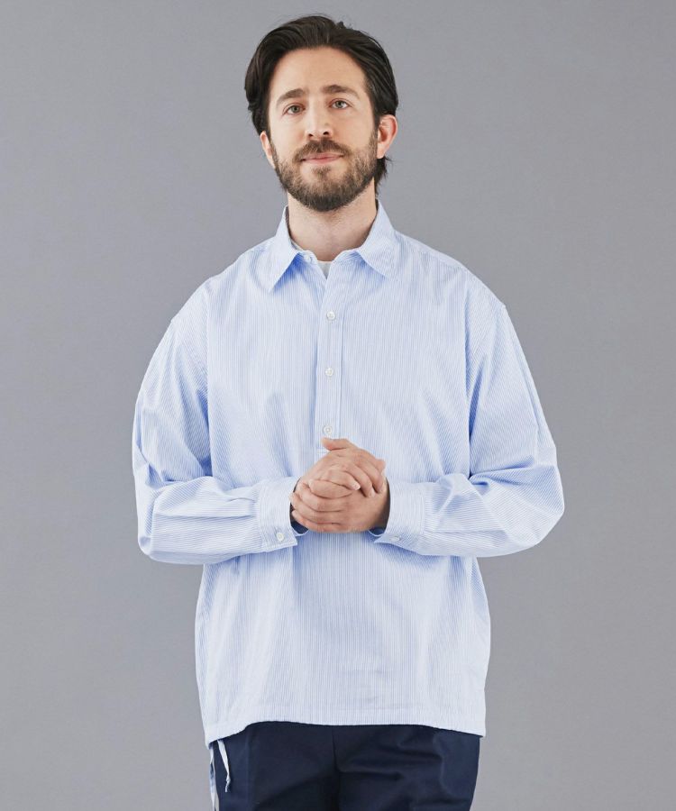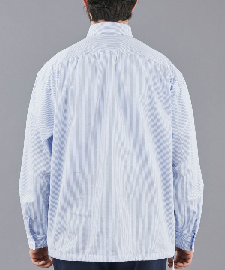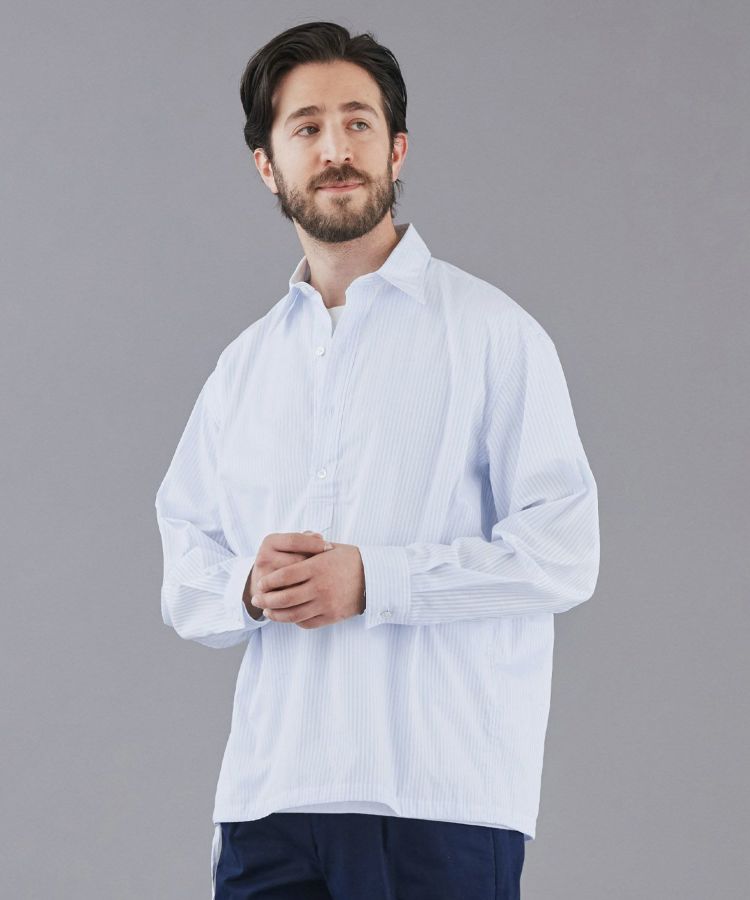 イタリアのカプリシャツのイギリス版をイメージし、カジュアルシーンで夏にサラッとラフに羽織れて大人らしい品のあるシャツを開発。襟のインカーブや柔らかい芯地のレギュラーカラーなどドレスシャツ/ロンドンとも通じる仕様。生地とカフスがある点はシャツ要素ですが、共地の紐を使い裾がブラウジングでき、タックアウトした時はブルゾンのようなシルエットに。またタックインのバランスを考慮した作りになっておりTPOに併せた装いが可能です。