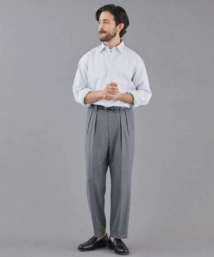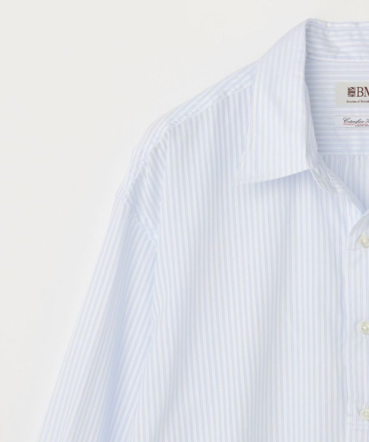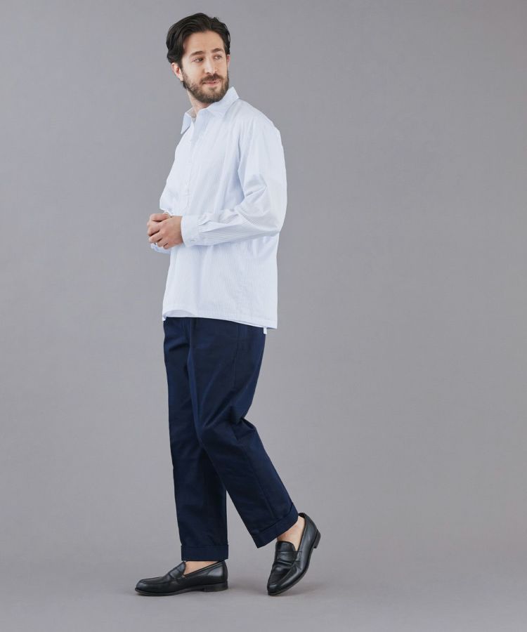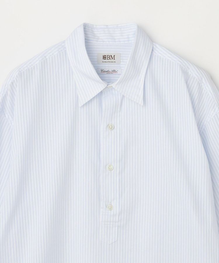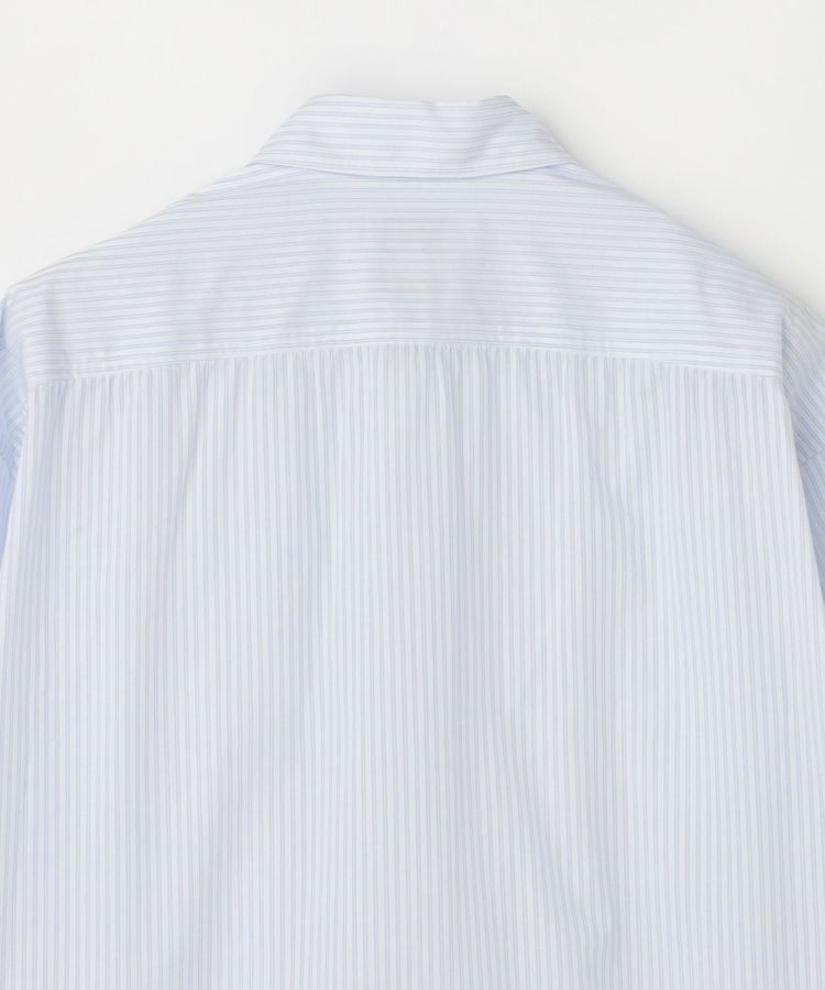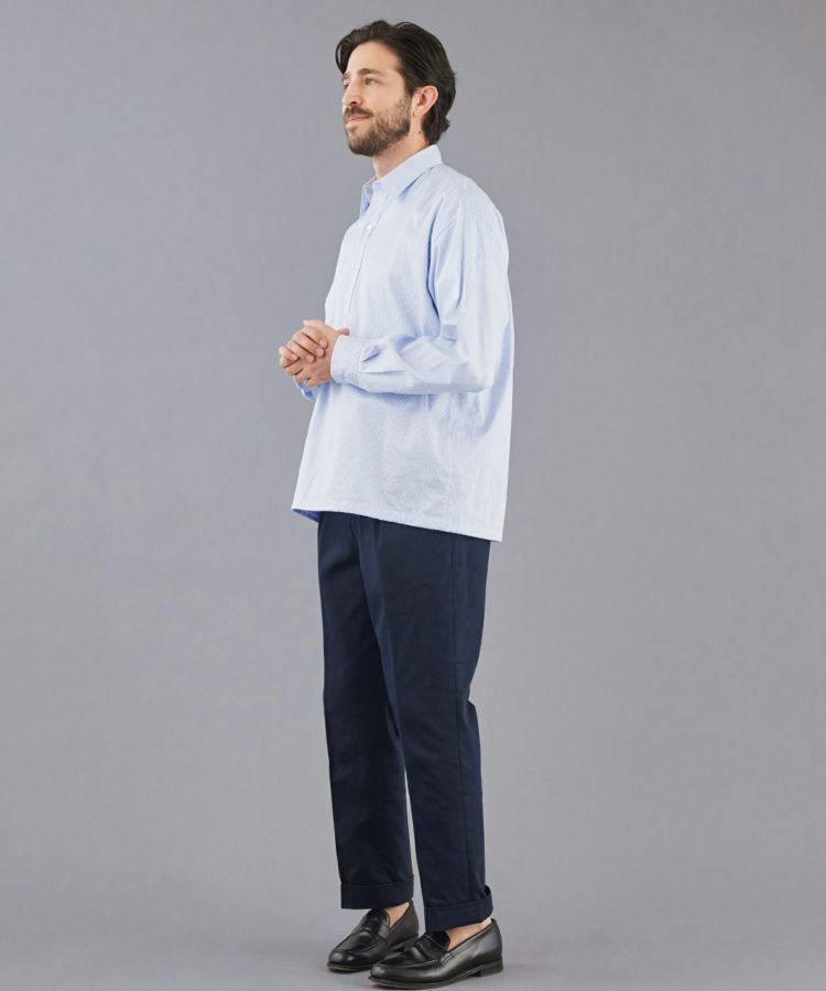 イタリアのカプリシャツのイギリス版をイメージし、カジュアルシーンで夏にサラッとラフに羽織れて大人らしい品のあるシャツを開発。襟のインカーブや柔らかい芯地のレギュラーカラーなどドレスシャツ/ロンドンとも通じる仕様。生地とカフスがある点はシャツ要素ですが、共地の紐を使い裾がブラウジングでき、タックアウトした時はブルゾンのようなシルエットに。またタックインのバランスを考慮した作りになっておりTPOに併せた装いが可能です。