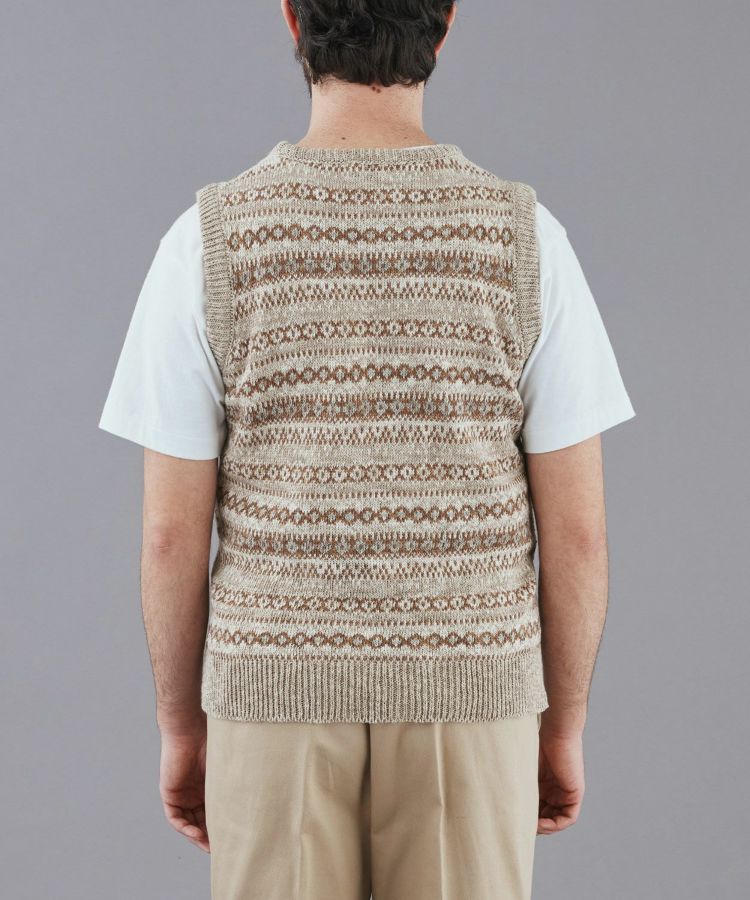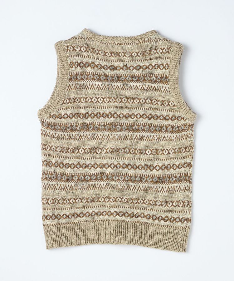 スコットランド発祥のクラシックなパターン、フェアアイルを取り入れた、英国らしいカントリースタイルのニットベストです。