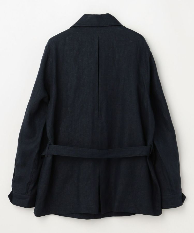 Aラインシルエットに、裾と背中に施されたインボックスのアクションプリーツが特徴的で、ベルトを巻いた際に裾に自然な膨らみが生まれ、動きやすさとエレガントさを兼ね備えています。さらに強めにデザインされた肩傾斜と、胸から肩、袖にかけて続くパターンが、カジュアルなジャケットとは一線を画し、スラックスなどのドレッシーなアイテムとも調和します。