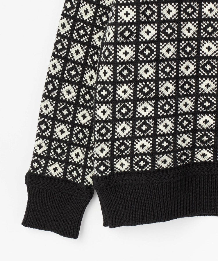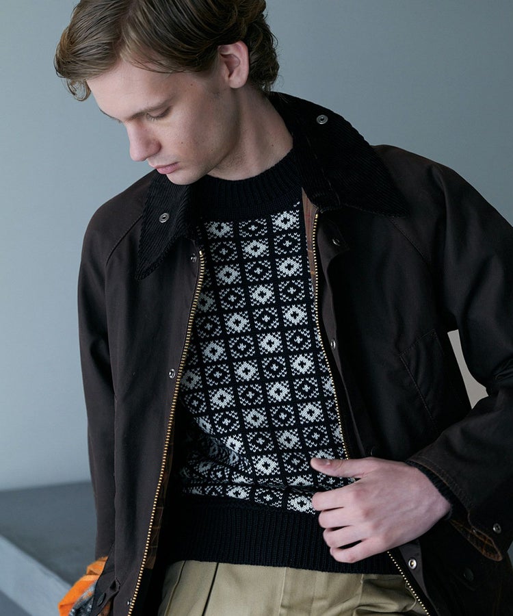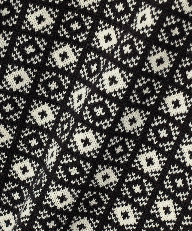 白と黒の印象的な幾何学模様が特徴で、トラッドなスタイルにはもちろん、モダンなコーディネートにも自然に馴染みます。フェアアイル柄が有名なスコットランドの伝統パターンに対し、あえて希少性の高いサンカ柄を採用することで、クラシカルな雰囲気と現代的なスタイルの両立を実現しました。