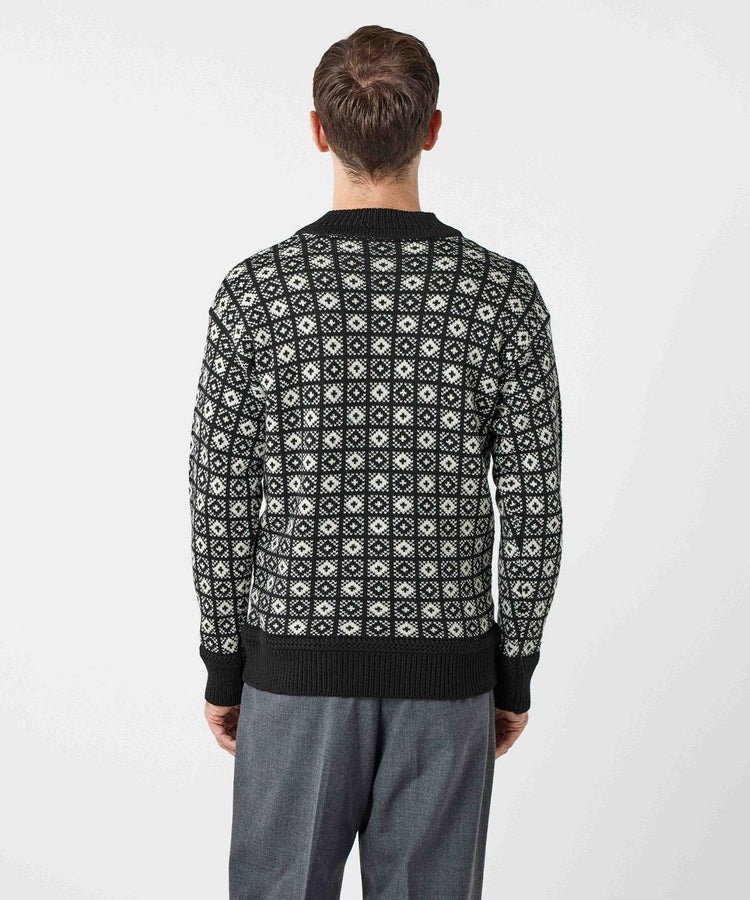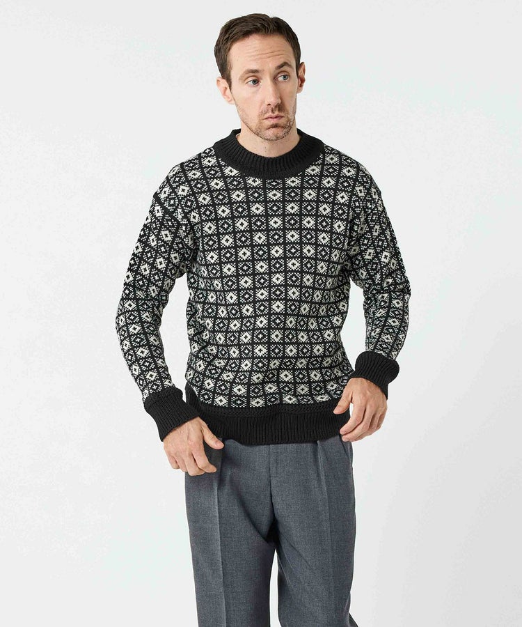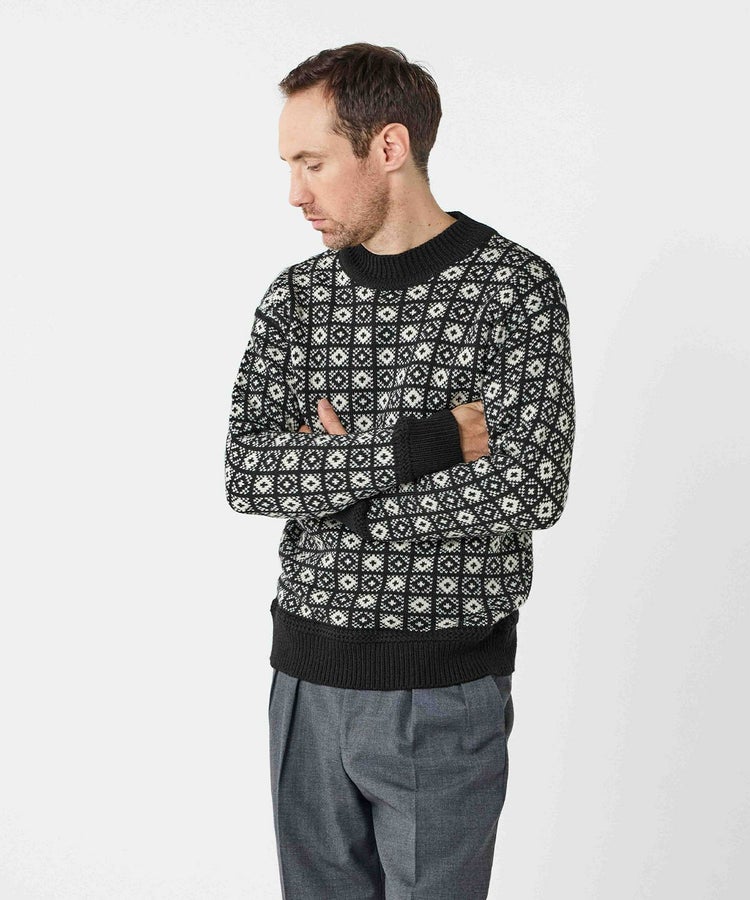 スコットランド南西部のサンカ(Sanquhar)で生まれた伝統的なニット、「サンカニット」。200年以上の歴史を誇るオーセンティックパターンを採用した、セットインスリーブのクルーネックニットです。
