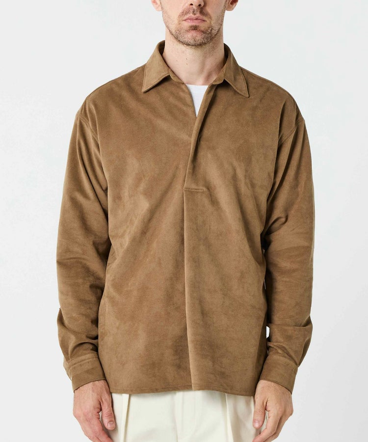 今回のコラボレーションで採用されたのは、カプリシャツのデザインを取り入れた、リゾートシーンにふさわしいブランド設立当初から続くベストセラー。裾をスクエアカットにすることで、タックアウトしてもバランスよく決まり、スラックスなどのクリーンなボトムスとも好相性。前開きのボタンループ仕様が、さりげない抜け感を演出しながらも上品な印象を保ちます。