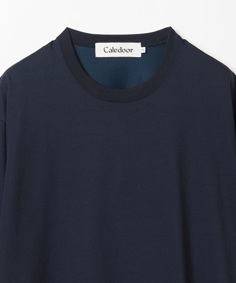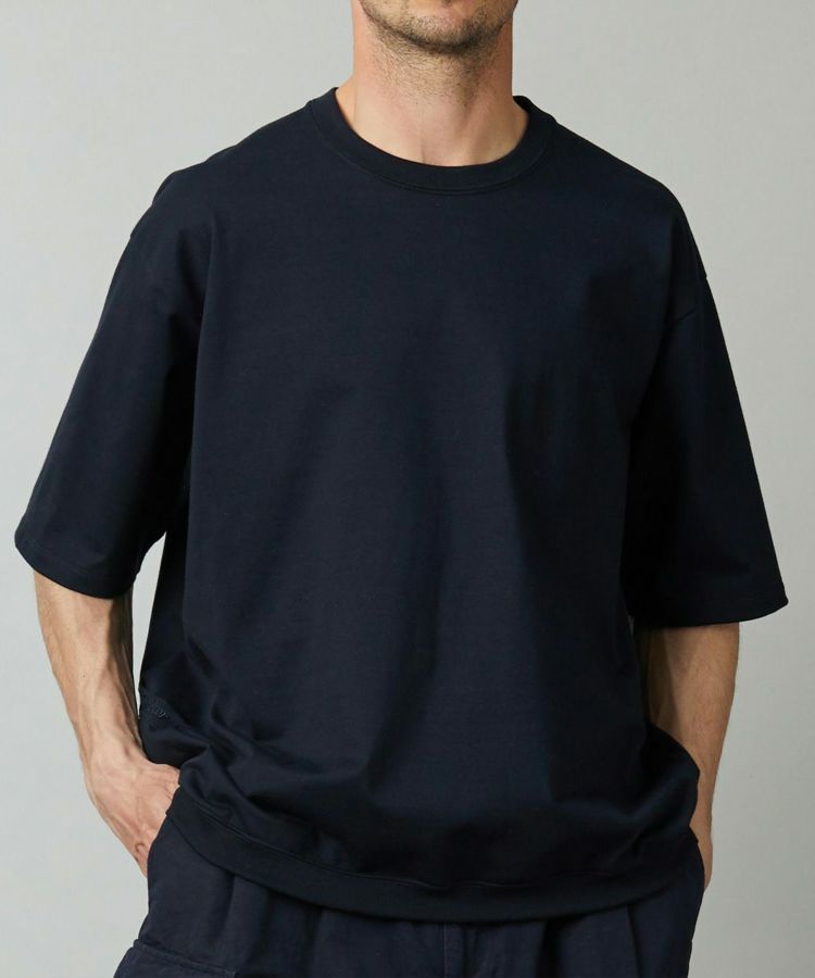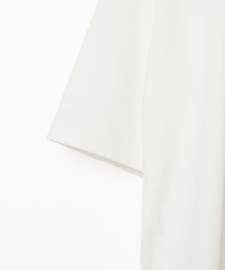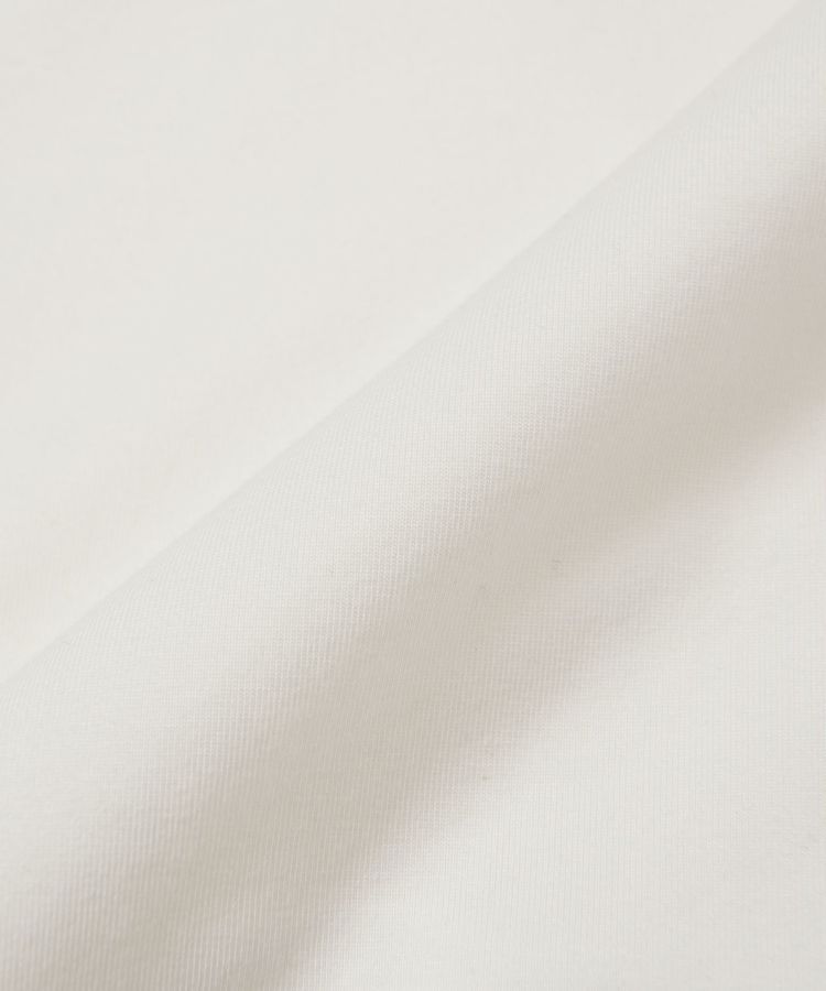 生地はコットンとナイロンをプレーティングしている二重組織素材。表面はコットン100%を使用しているためナチュラルなコットン素材の風合いがあり、裏面の肌に直接触れる部分は速乾性と接触冷感のある機能素材を採用しています。裏面のナイロンの素材感により、コットン100%では表現できない独特なハリとコシのある立体的なフォルムに仕上がっています。