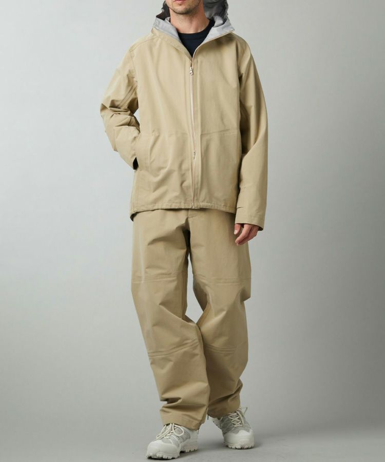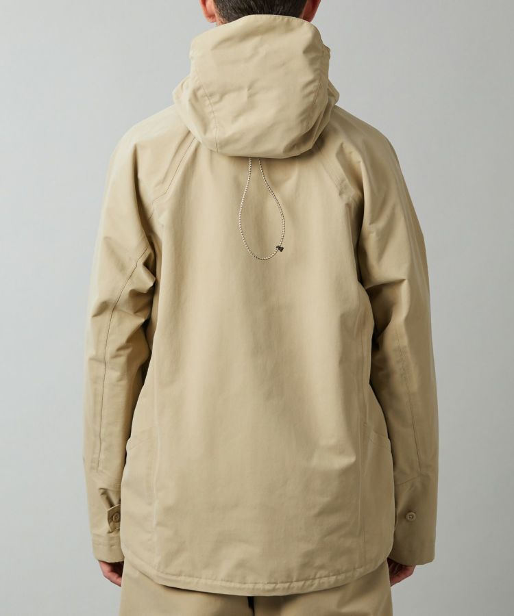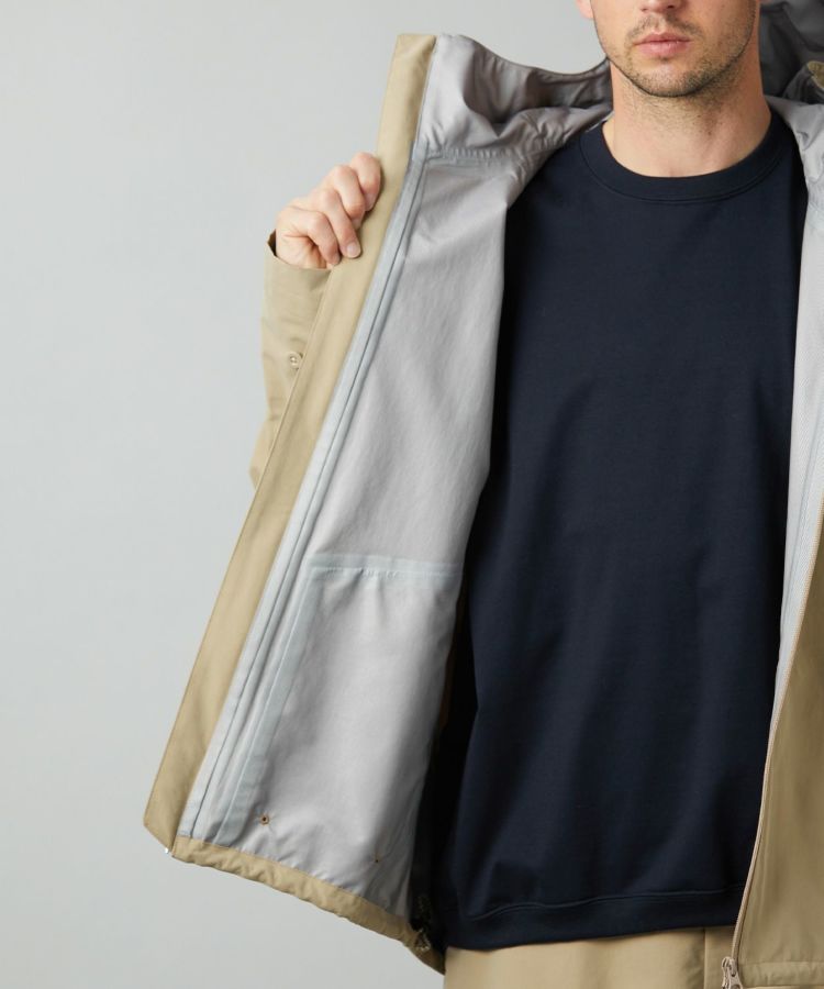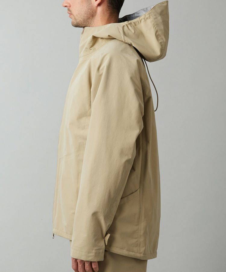 強い雨や吹雪でも水の侵入を防げる耐水圧20,000mmレベル / 透湿度8,000g/m2/24hrレベルの透湿防水ナイロン素材を採用。表面と裏面にはポリコット系、その間にフィルムが入っている3レイヤー構造のため、裏地がなくても蒸れることなく快適に過ごせます。ハリコシのあるテクニカルな機能系素材ながらも、起毛感のあるコットンライクなナチュラルな風合いで、タウンユースでも活躍するアイテムです。
