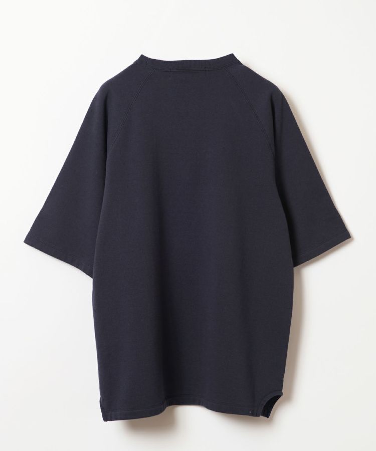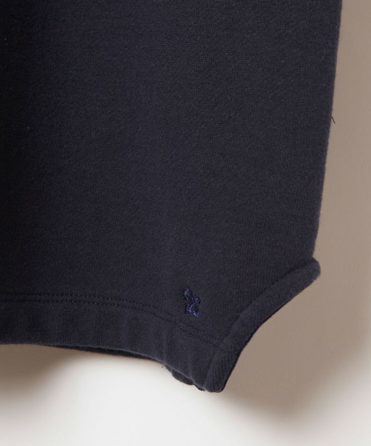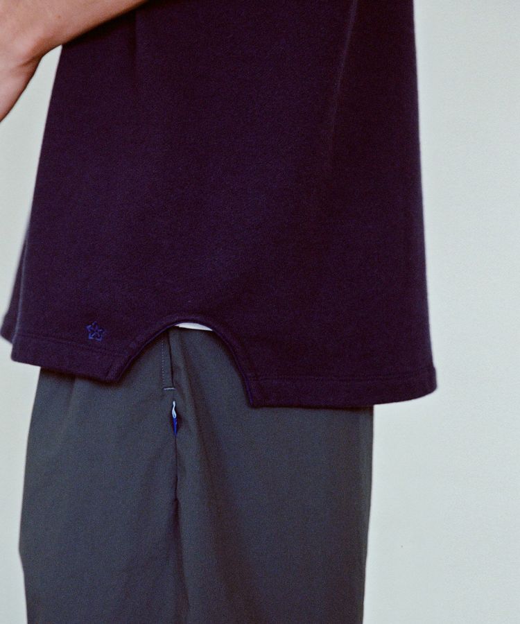 袖と裾はリブ無しの2本針始末にしているため、レイヤードを楽しめるアイテムに仕上げています。パンツのポケットに手を入れやすいよう切り抜きスリットを作り、無駄のない動きをサポートするディテールを取り入れています。