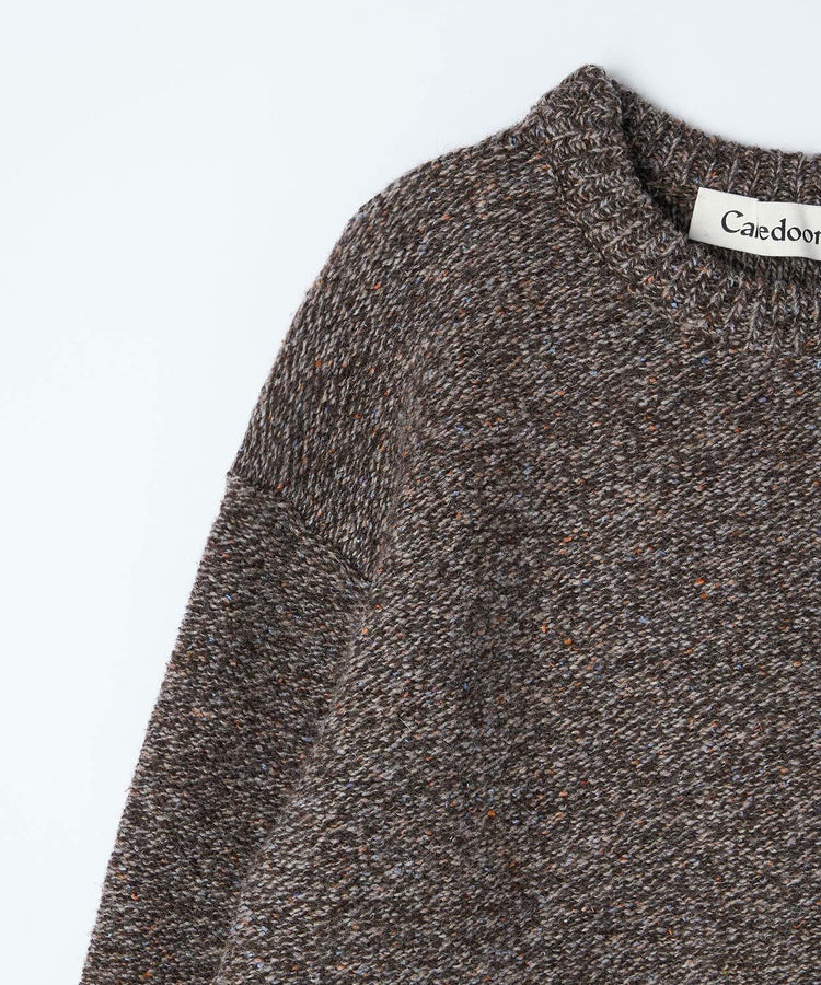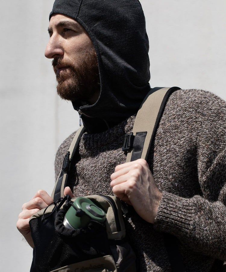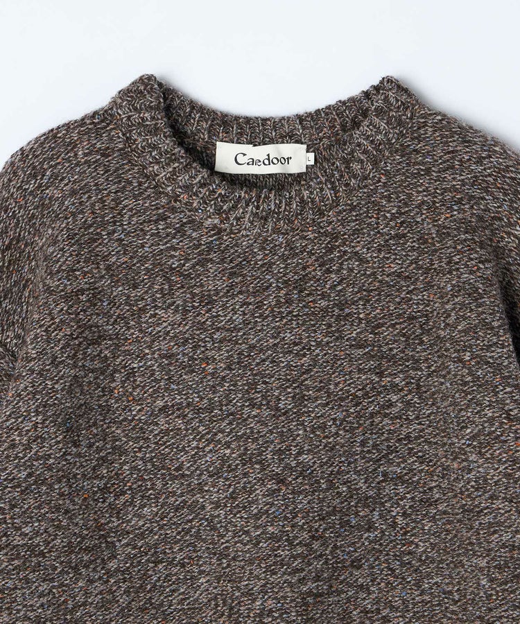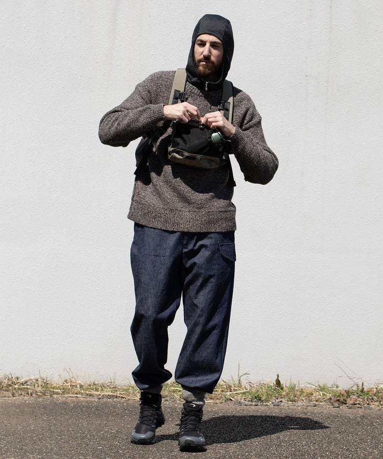 デザインは過去にマカラスターには存在しなかった形を製作。糸はcaledoorオリジナル色の依頼をした引き揃え糸で作成しています。タウンユースでもアウトドアでも使いやすいアイテムへと進化させるべく、アームホールや身幅は従来モデルよりも大きく、肩線をズラすなど細部をアレンジ。また、既存のマカラスターのニットに比べ、さらに度目を詰めることで重厚感がある風貌に仕上げています。シルエット・着用感はミッドレイヤーとしても使える、ランブリングに適した絶妙なサイズ感になっています。