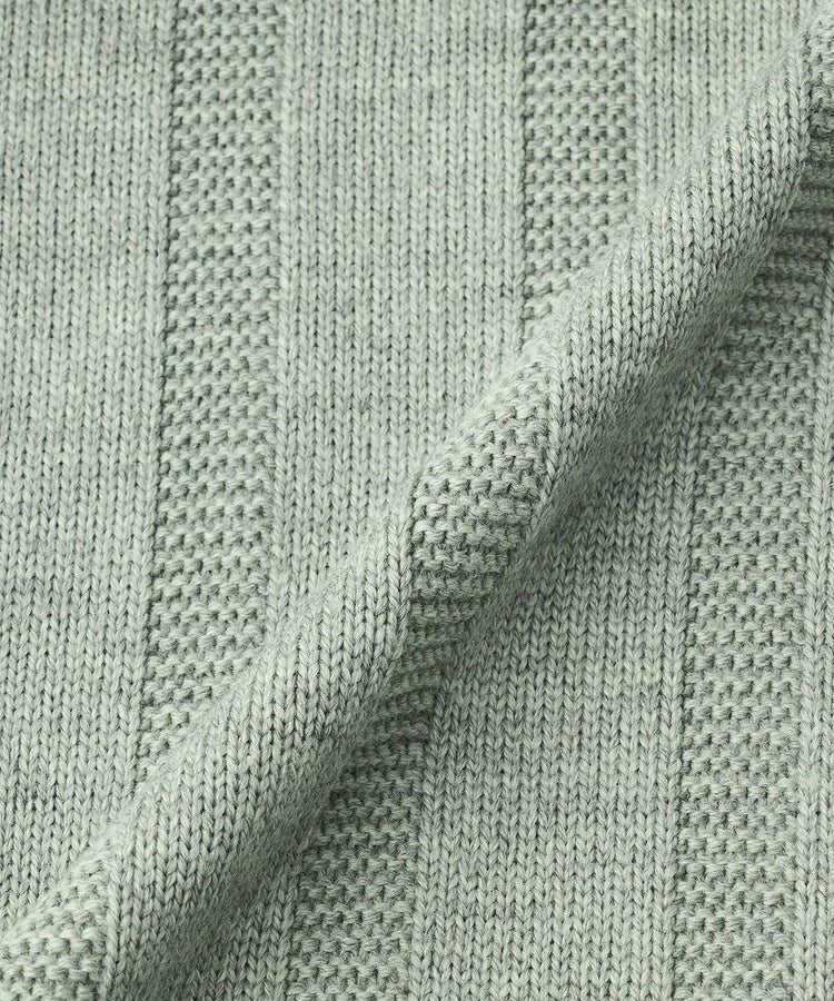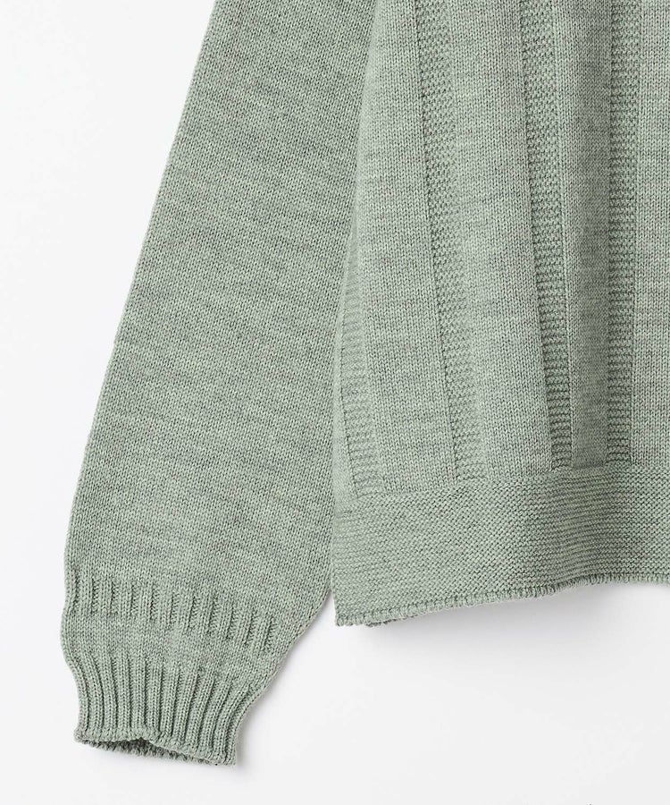ガーター編みによるストライプ柄と、裾のスリット仕様が軽やかな印象を演出。脇下のガゼット(マチ)構造により着脱の容易さと動きやすさを実現しました。素材には英国羊毛に代えてメリノウールを採用することで、なめらかな肌触りと優れた保温性を両立させています。