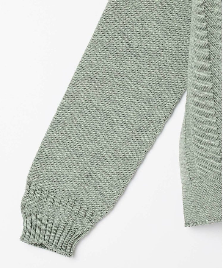 素材は日本であまり見かけない、イングランドのペナイン山脈中部に位置するShepley Yarns社の「マリオラメリノ」を使用。メリノウールの原産地であるスペインの生産者と提携して作られた糸で、虫害や病気予防のための"ミュールジング"を行わない環境に配慮した原毛を使用しています。Guernsey Woollens初のメリノウールを使用したニットアイテムです。糸にはわずかに紡績油が残されており、編み上がり後にウール用洗剤で洗い上げることで、よりふっくらとした密度のある風合いへと変化します。