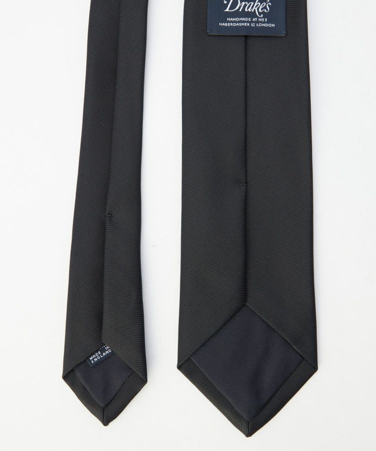 50オンスという重みのある上質なシルクを使っており、艶感が非常に上品で、シワになりにくく、美しいディンプルを作ることができます。ネイビーやチャコールグレー等のベーシックなスーツに合わせても馴染みよく、シャツも無地からストライプなど柄物まで幅広く合わせることができます。特にダークカラーは、ドレススタイルでは欠かすことの出来ない王道の一本と言えます。