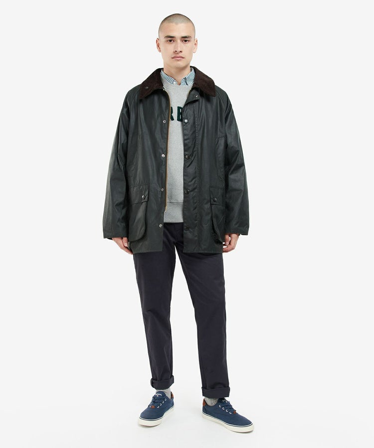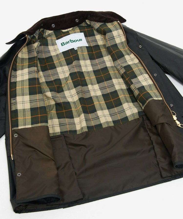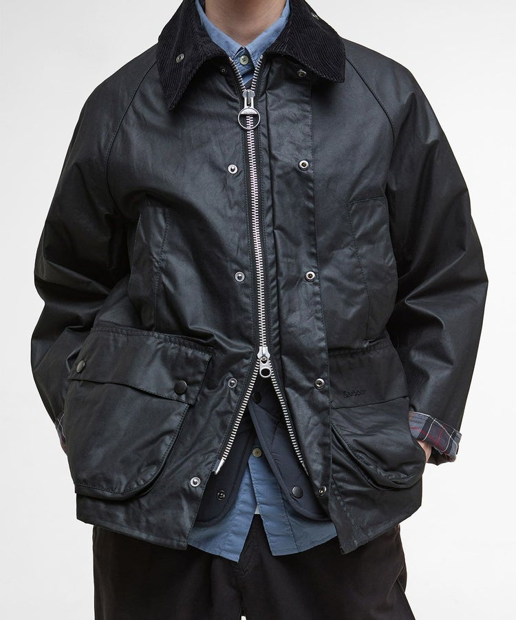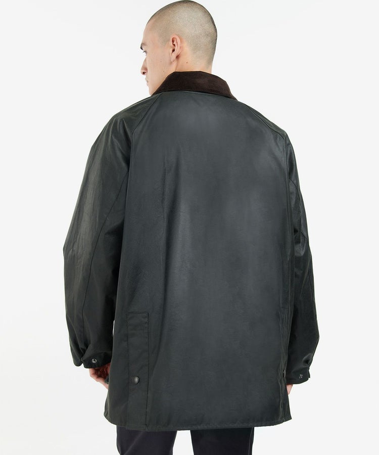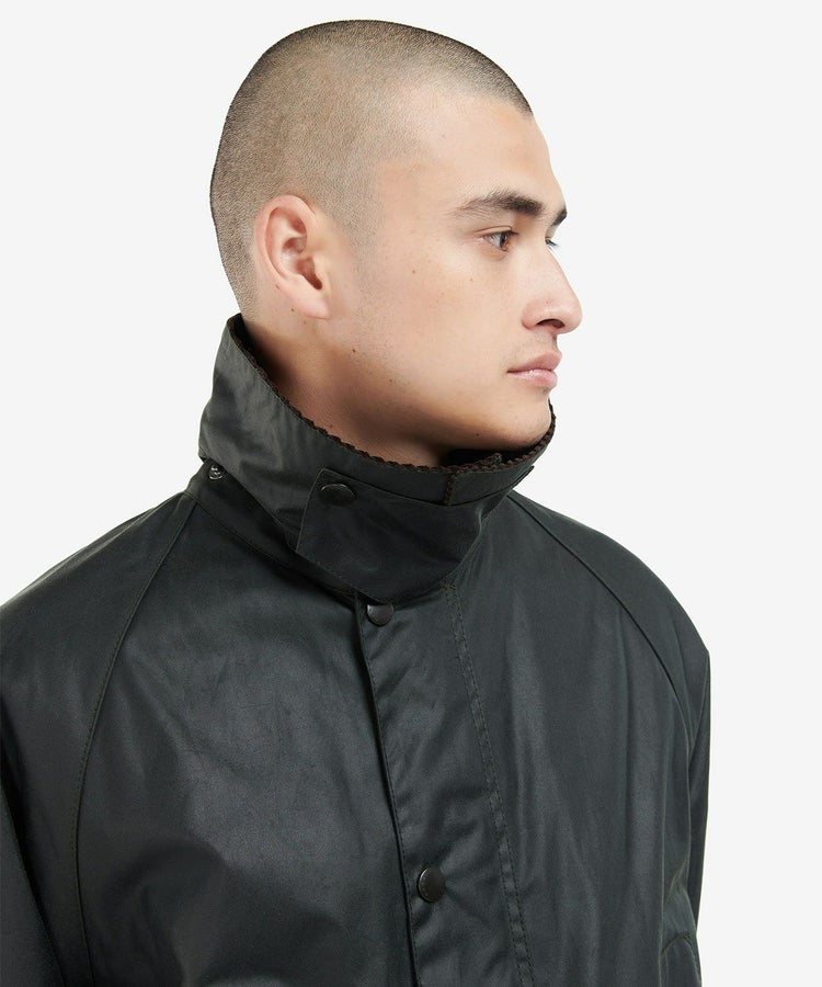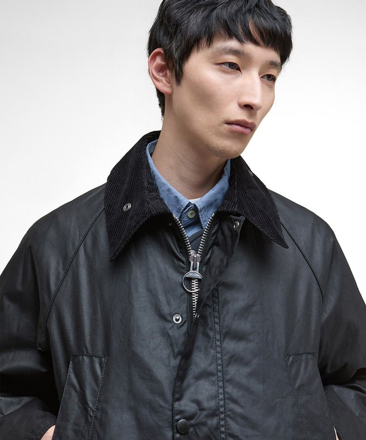 スーツに合わせても綺麗に見える着丈、動きを制限しないサイドベンツ、ラグランスリーブ、ポケットには防寒性の高いハンドウォーマーと風の入り込まないリブ仕様。そしてオイルドコットンの生地と大ぶりの襟にはコーデュロイ生地が用いられ、バブアーと言えばまさにこのモデルといった王道の風格を醸し出しています。