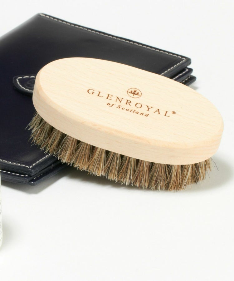 グレンロイヤルのアイテムは定期的にメンテナンスをすることで、キレイに末永くご使用いただけます。メンテナンスする際は、ブライドルレザー用ワックス「DUBBIN(ダビン)」と一緒にお使い下さい。ブラシはブルーム(蝋)を落とす際にもお使い頂けます。