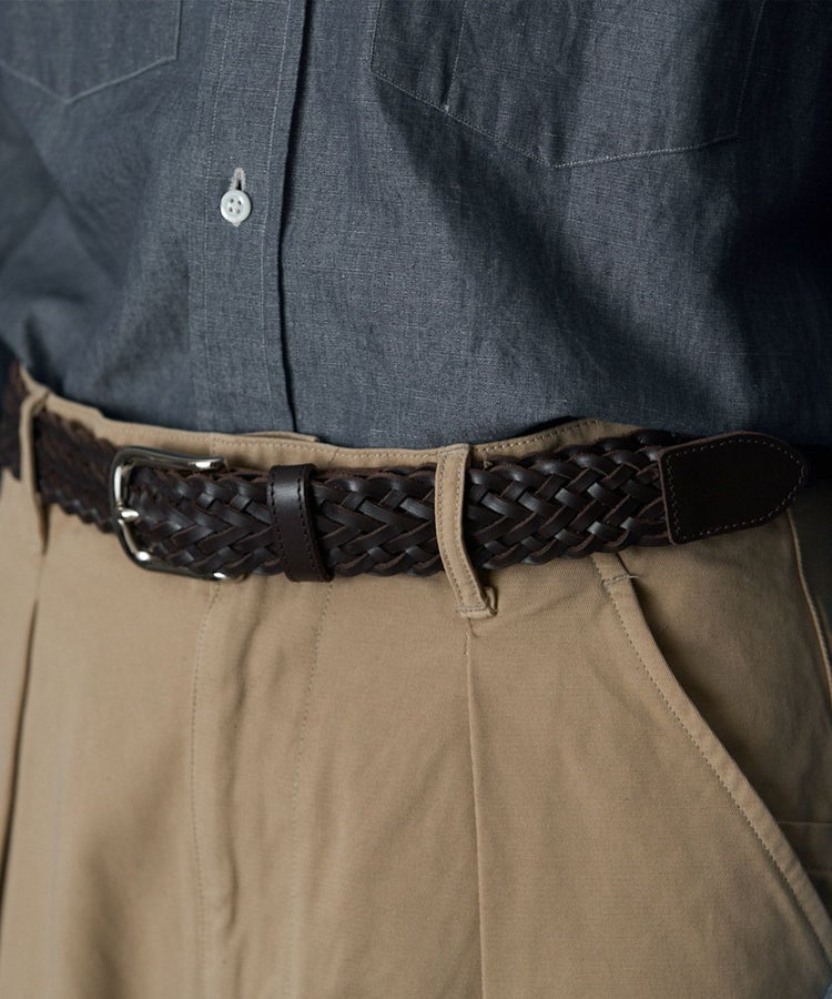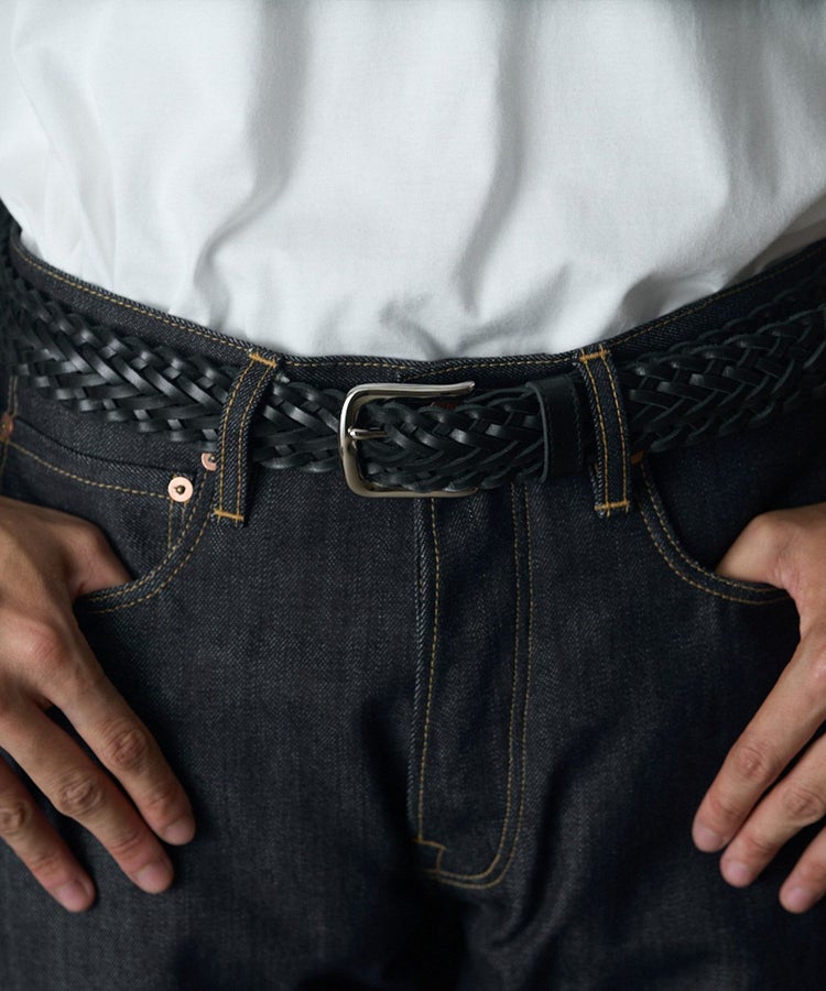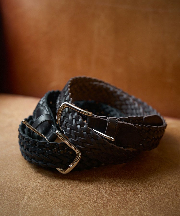 ブライドルレザー製のメッシュベルトは、ほかでは見ない珍しい逸品です。ベルト穴が無くサイズレスで使用出来るのも嬉しいポイント。手編みのベルトは伸縮性があり、日々のウエスト周りの変化に程よく馴染みます。ジャケパンスタイルからカジュアルまで幅広いコーディネートで活躍します。