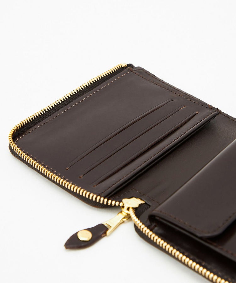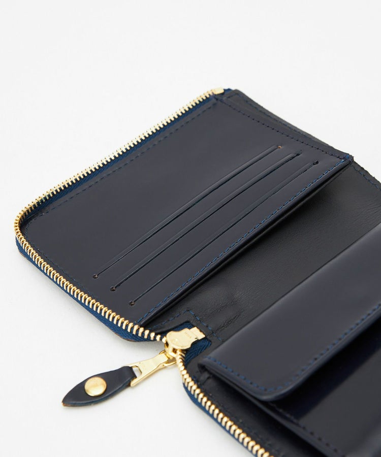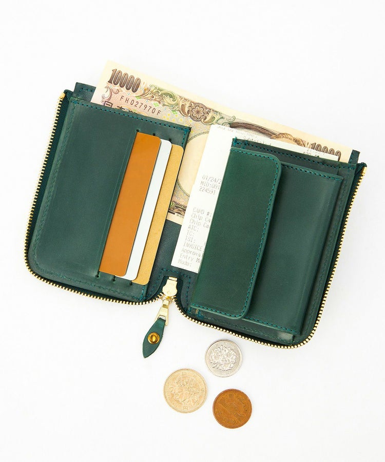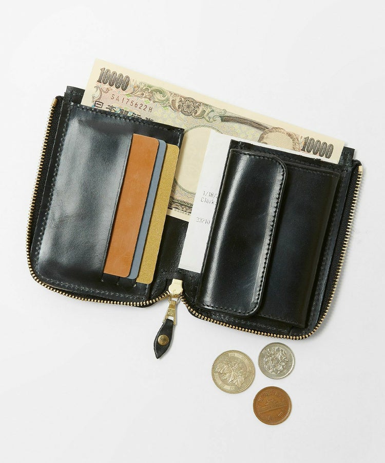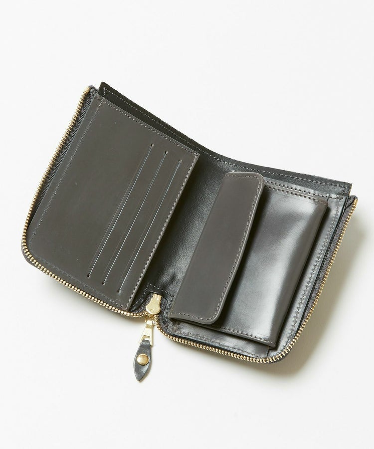 手のひらに収まるサイズ感ながら充実した収納力を兼ね備える、L字型ファスナータイプの2つ折り財布。