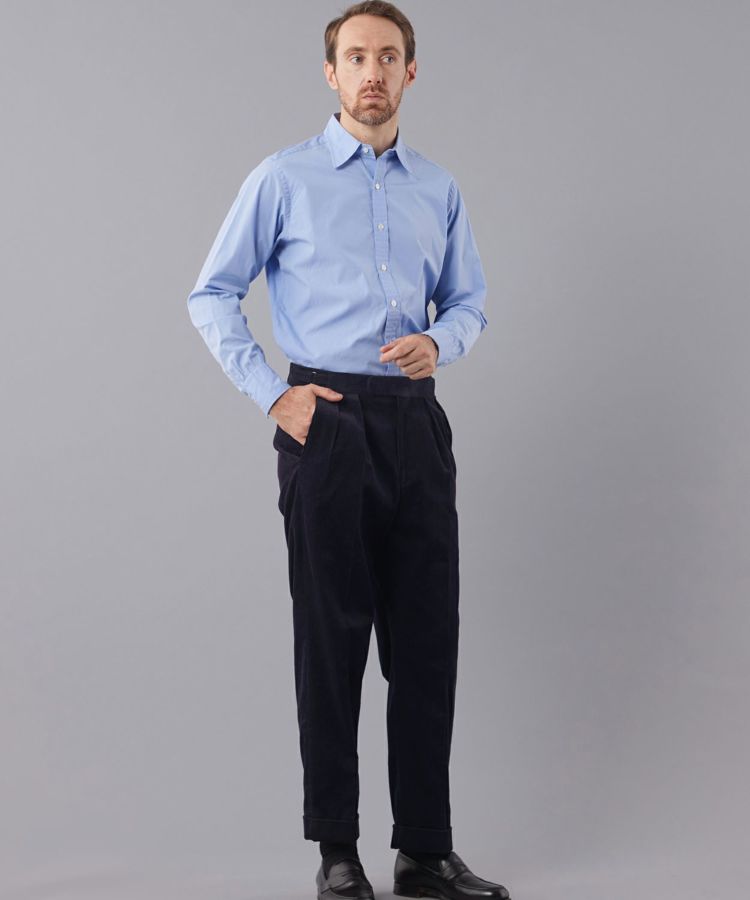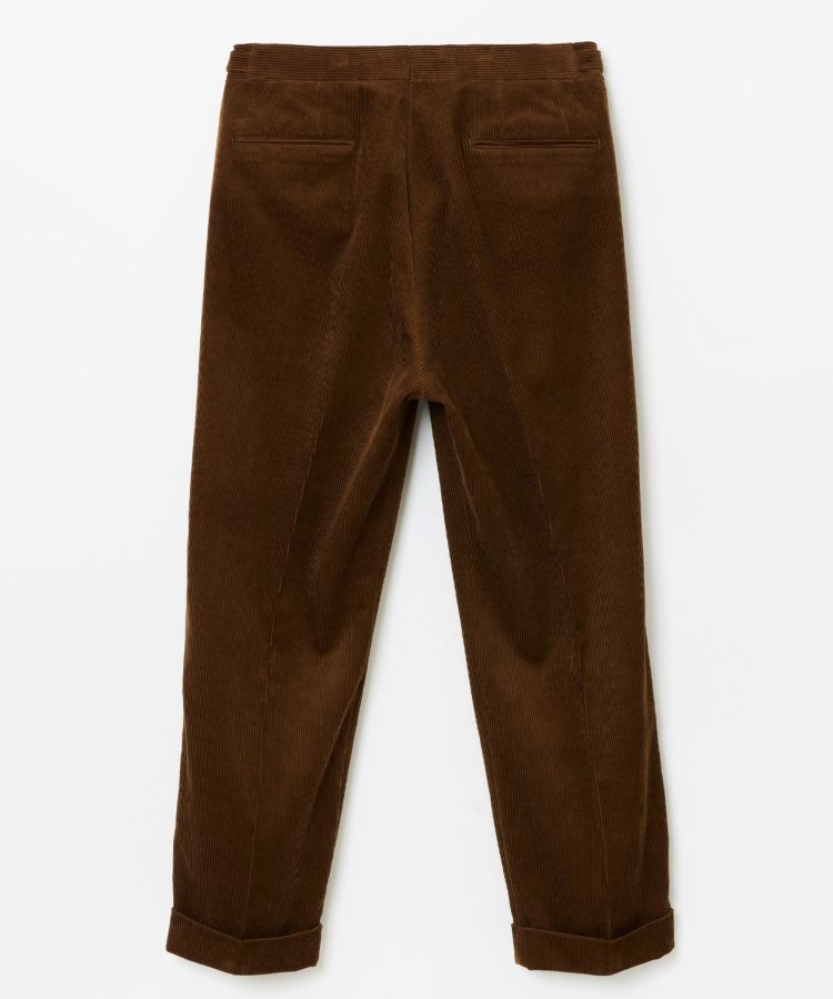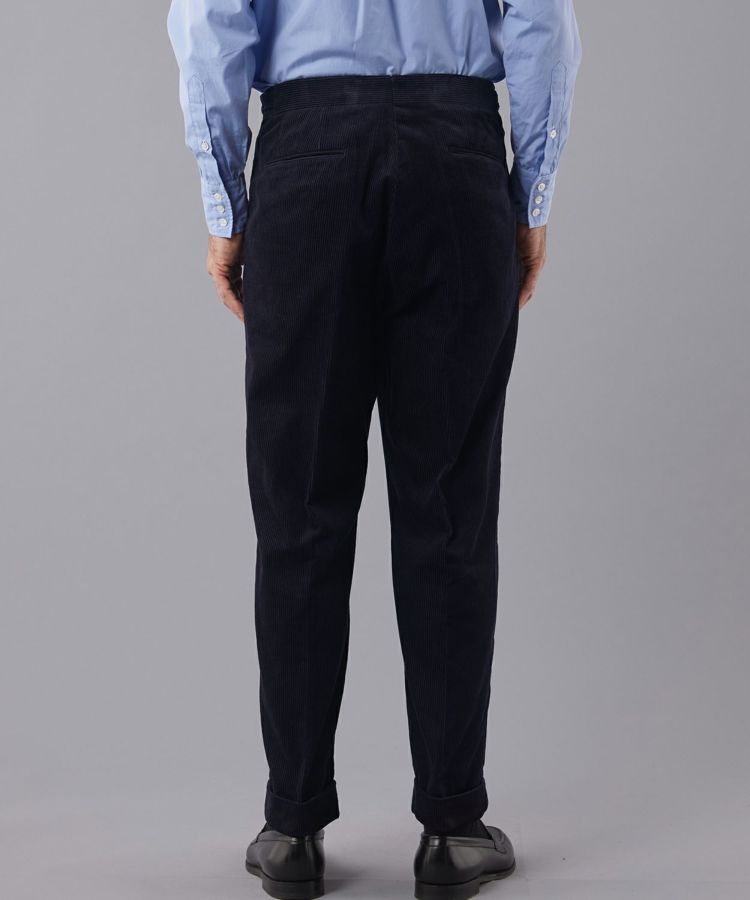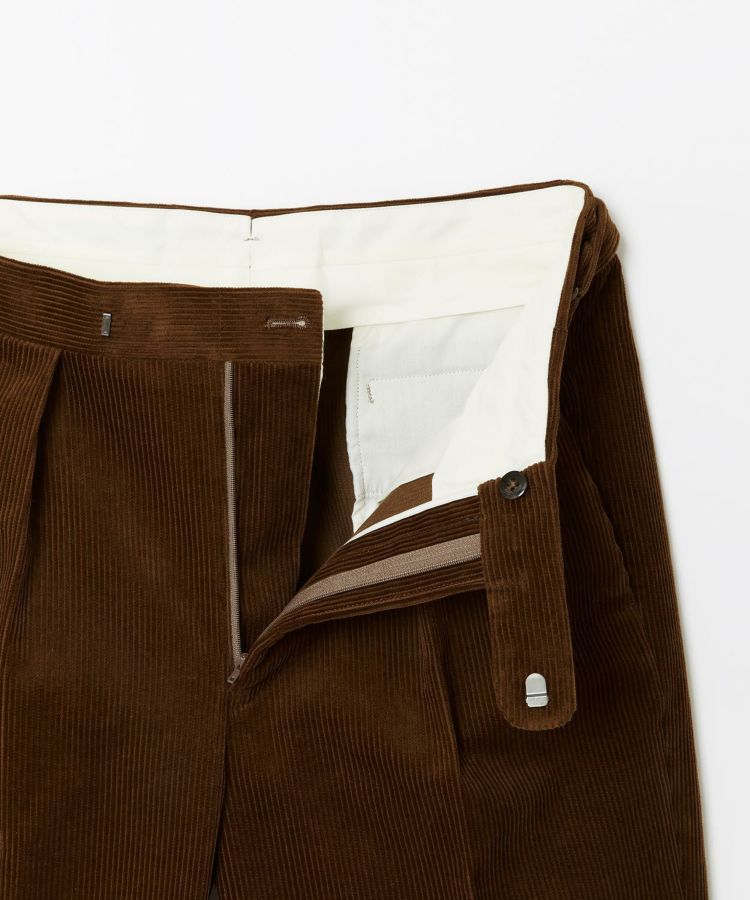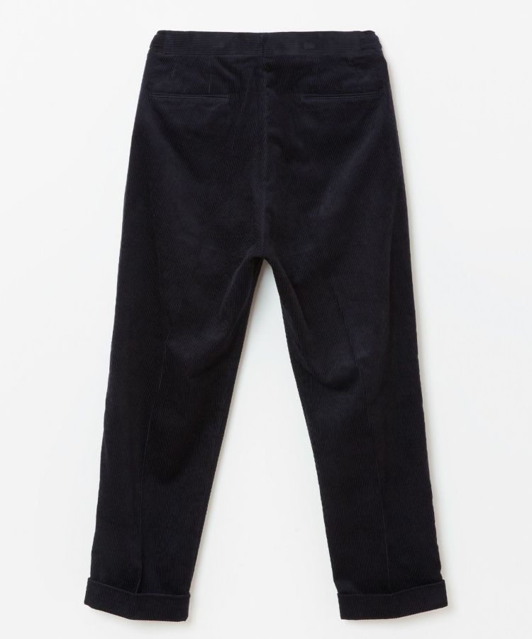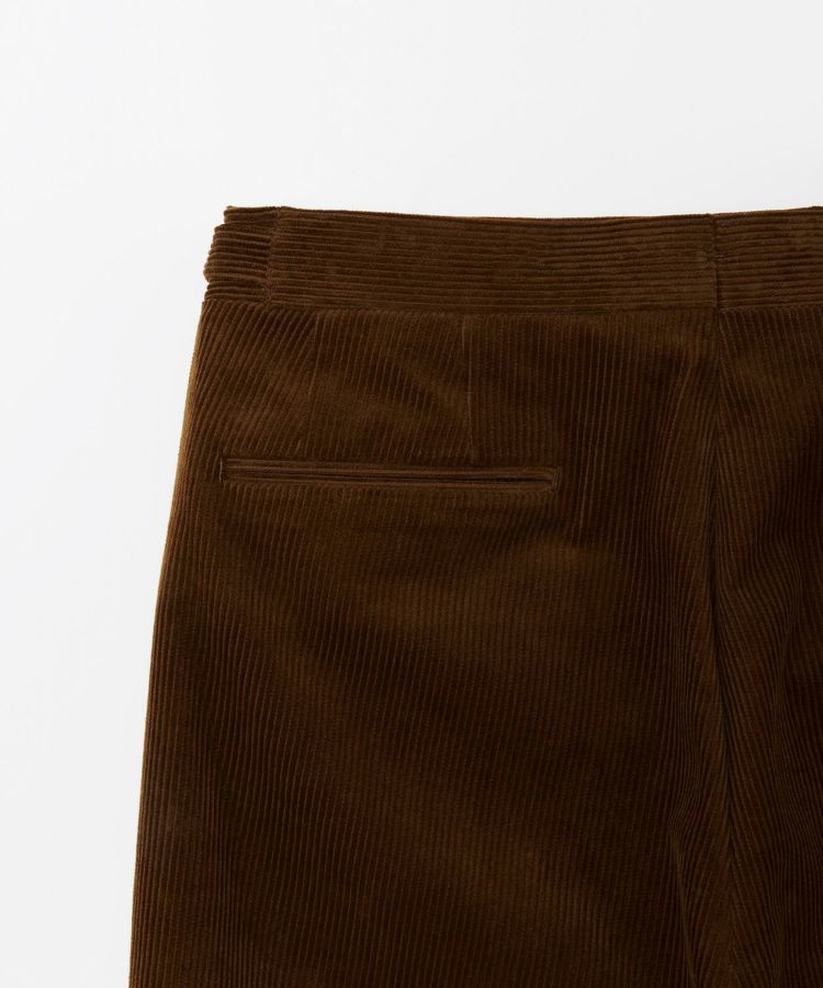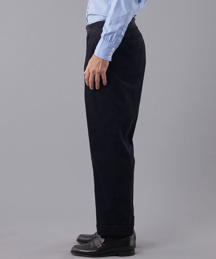 従来のモデルから持ち出しの長さと先の形状を全体のバランスを考慮しアップデート。イメージソースとしたのは1960年代のロイヤルネイビー(英国海軍)のホワイトドリルトラウザーズ。ベルトループが無い“ベルトレス”で穿くクラシックなディテールで英国らしい上品さが魅力の一つ。サイドアジャスターはバックル調整ではなく、ボタン調整になっております。本来のシルエットよりも膝と裾巾を細くしテーパード感をやや強めたオリジナルバランス。パターンに振り込みを入れて、真っ直ぐ立った時に、キレイにストンと落ちるよう工夫を入れ立ち姿の美しいシルエットにも拘りました。ヒップサイドの脇線は真っ直ぐではなくカーブを強くし、もたつかないようフィットするデザインに。またマーベルト(※)仕様のためシャツをタックインした際にズリ上がり難くなっております。シルエットの綺麗なポーツマスに季節感が漂う太畝のコーデュロイを取り入れ、カジュアルな着こなしにはもちろん、少しはずしたキレイ目なスタイリングまで秋冬シーズンの幅広いコーディネートで活躍するアイテムです。