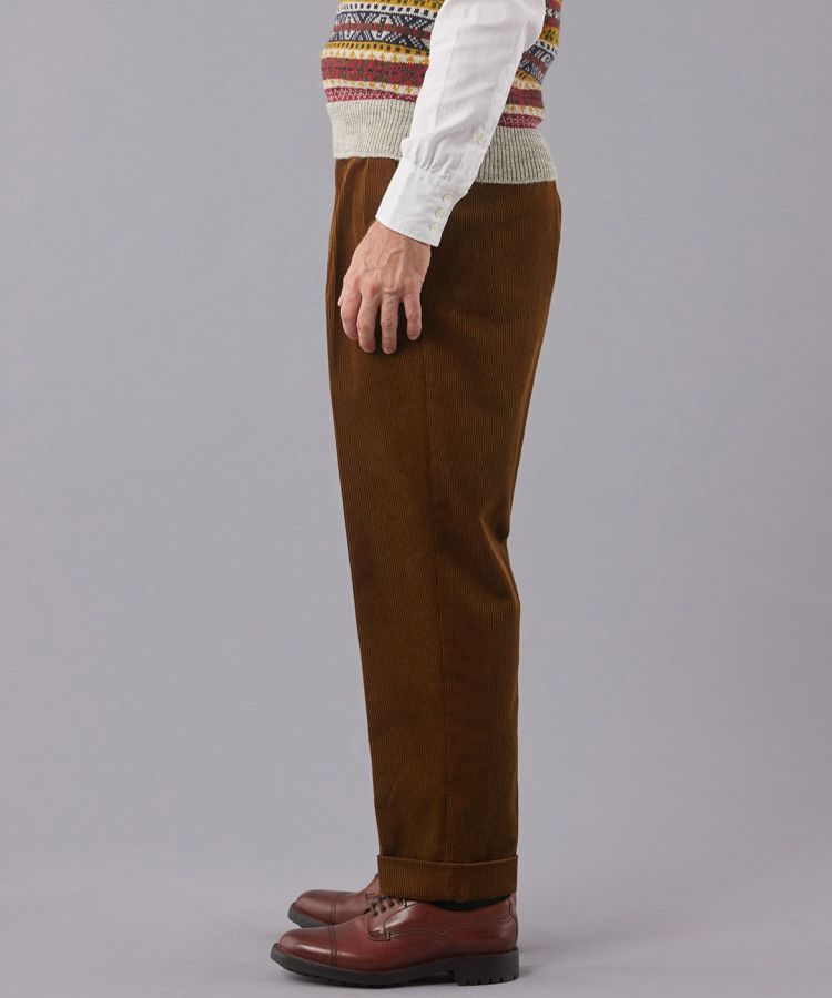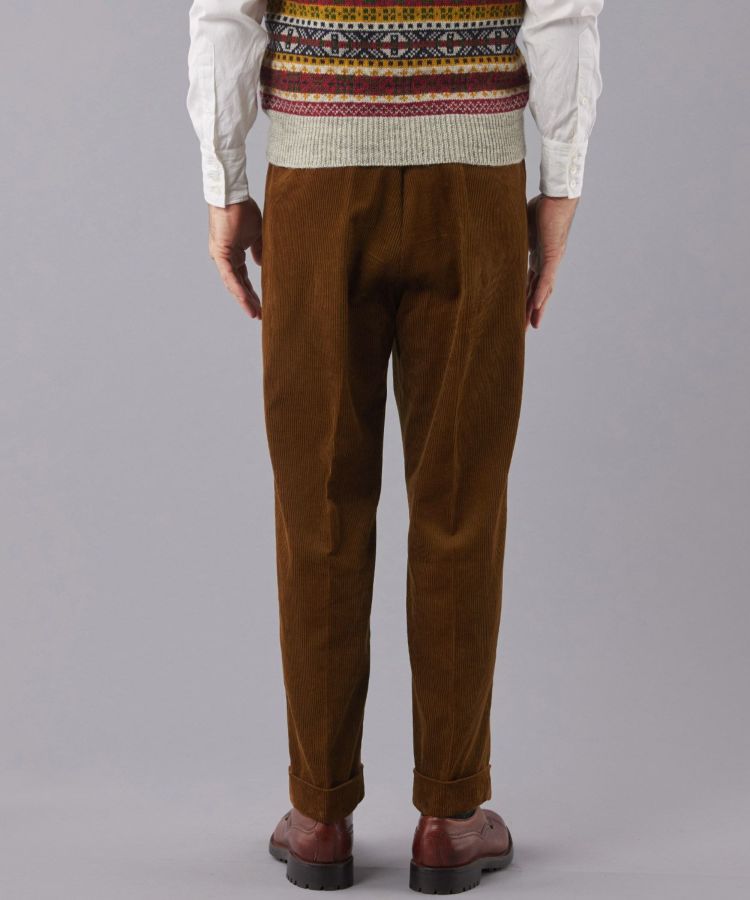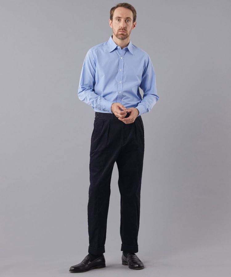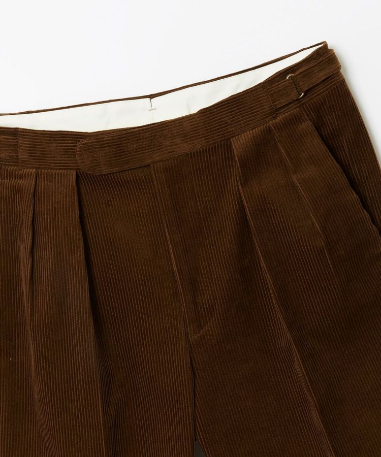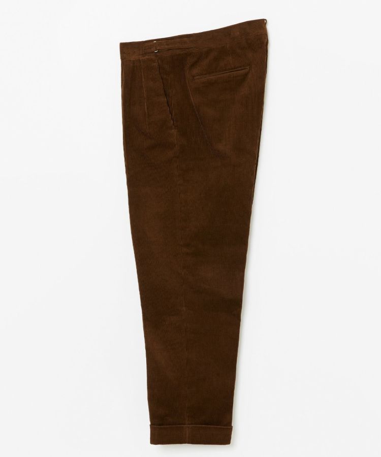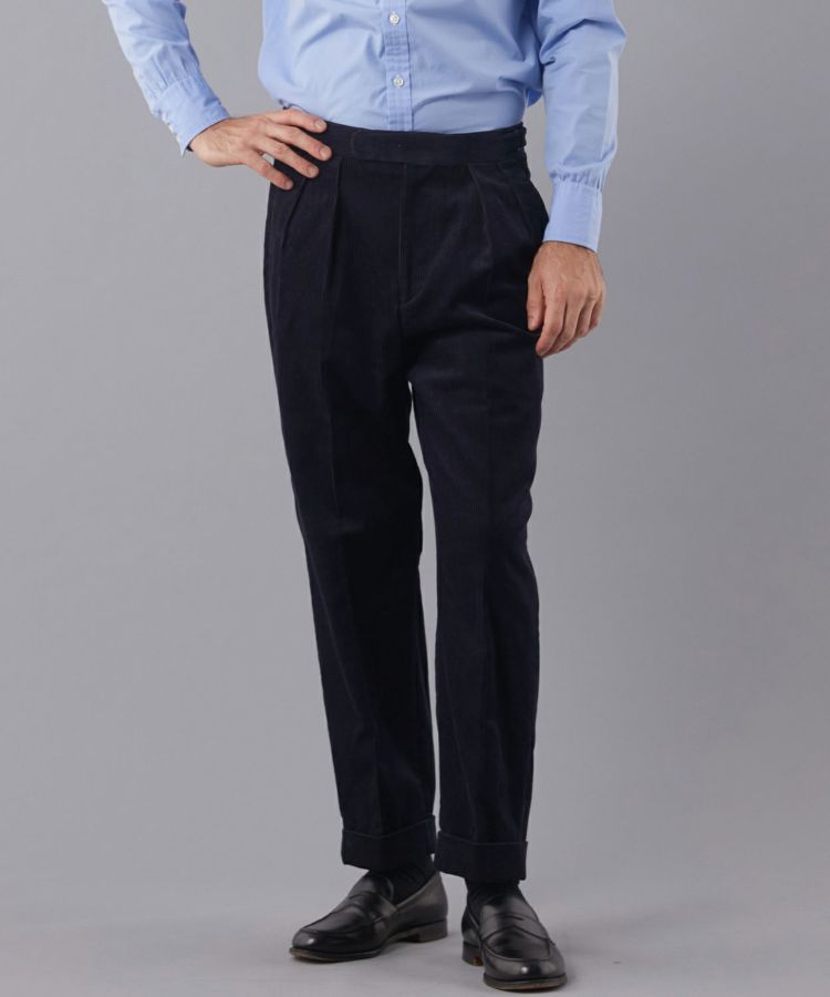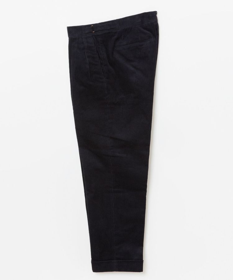従来のモデルから持ち出しの長さと先の形状を全体のバランスを考慮しアップデート。イメージソースとしたのは1960年代のロイヤルネイビー(英国海軍)のホワイトドリルトラウザーズ。ベルトループが無い“ベルトレス”で穿くクラシックなディテールで英国らしい上品さが魅力の一つ。サイドアジャスターはバックル調整ではなく、ボタン調整になっております。本来のシルエットよりも膝と裾巾を細くしテーパード感をやや強めたオリジナルバランス。パターンに振り込みを入れて、真っ直ぐ立った時に、キレイにストンと落ちるよう工夫を入れ立ち姿の美しいシルエットにも拘りました。ヒップサイドの脇線は真っ直ぐではなくカーブを強くし、もたつかないようフィットするデザインに。またマーベルト(※)仕様のためシャツをタックインした際にズリ上がり難くなっております。シルエットの綺麗なポーツマスに季節感が漂う太畝のコーデュロイを取り入れ、カジュアルな着こなしにはもちろん、少しはずしたキレイ目なスタイリングまで秋冬シーズンの幅広いコーディネートで活躍するアイテムです。