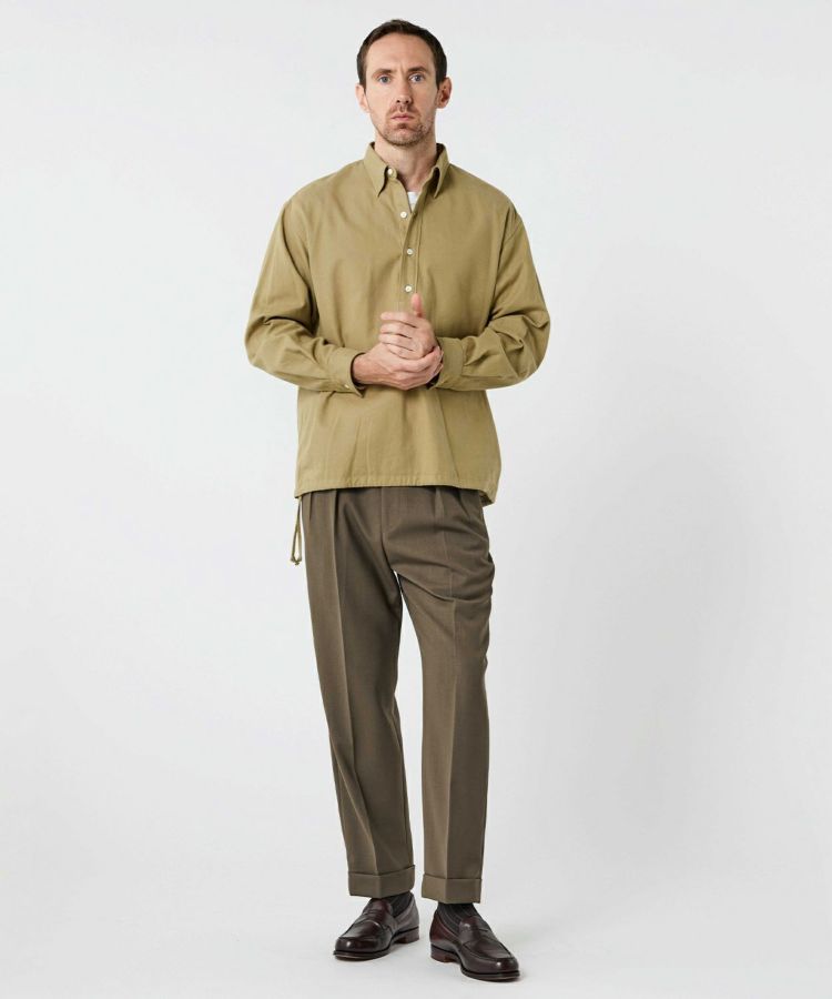 イメージソースとしたのはロイヤルネイビー(英国海軍)のホワイトドリルトラウザー。本来のシルエットよりも膝と裾巾を細くしテーパード感をやや強めたオリジナルバランス。パターンに振り込みを入れて、真っ直ぐ立った時に、キレイにストンと落ちるよう工夫を入れ立ち姿の美しいシルエットにも拘りました。ヒップサイドの脇線は真っ直ぐではなくカーブを強くし、もたつかないようフィットするデザインに。オンオフがシームレス化する今のライフスタイルに最適なパンツです。