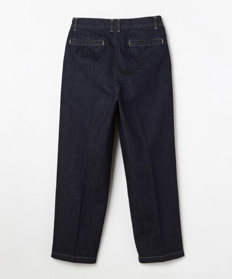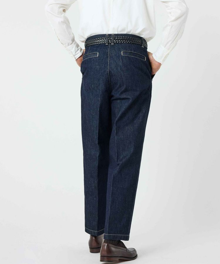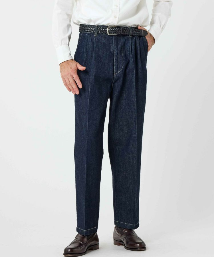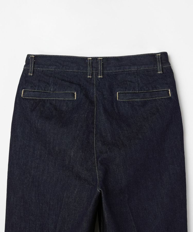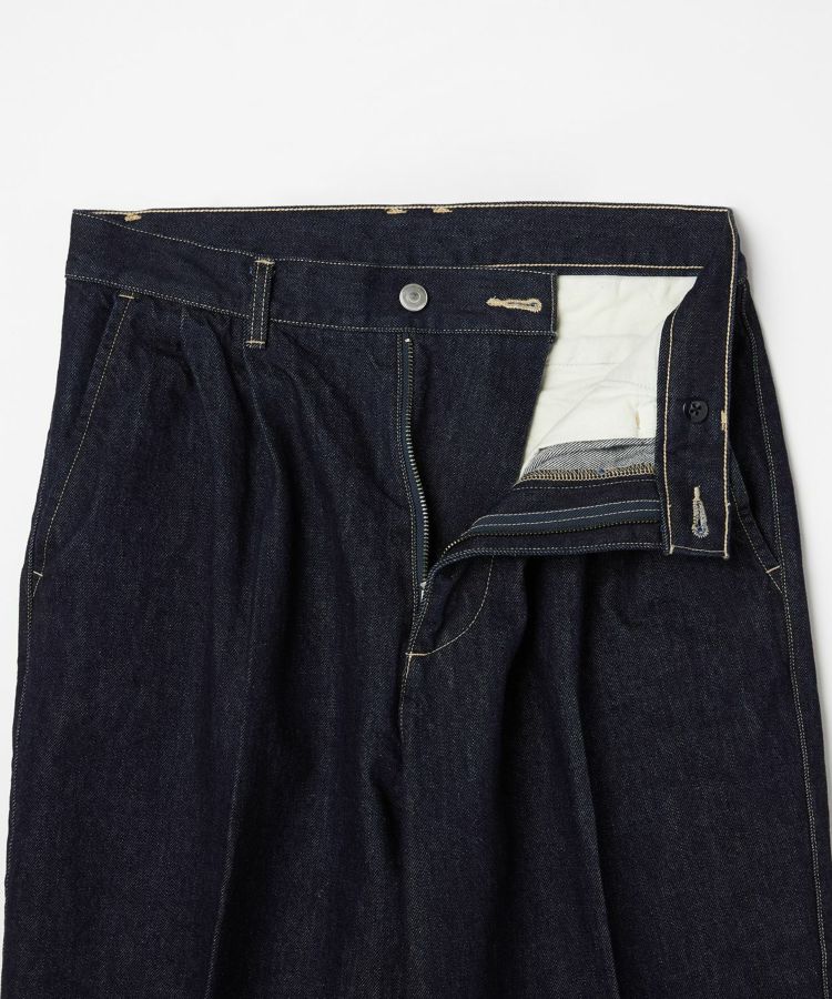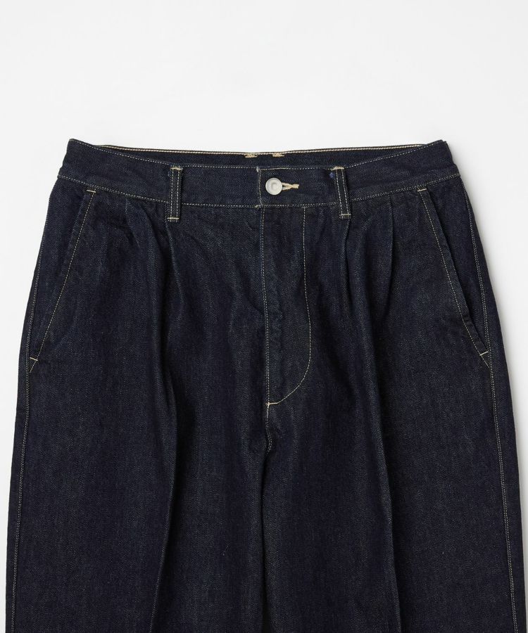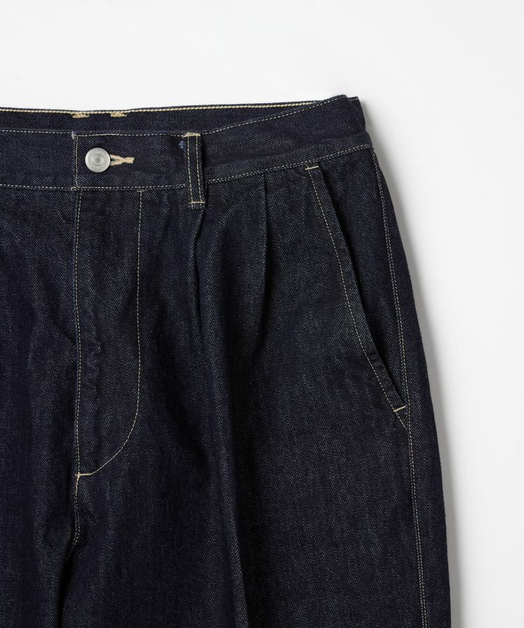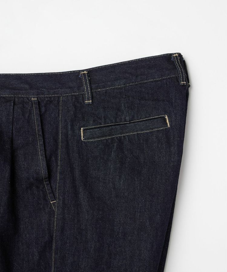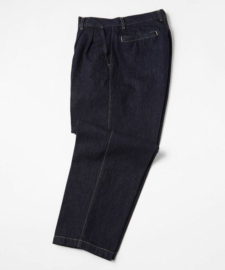 センタークリースを通したドレストラウザーのパターンをベースにしながら、縫製はあえてカジュアルパンツ専門の工場で行うことで、上品さとラフさを兼ね備えた一本に仕上げました。ヒップやワタリにはゆとりを持たせ、裾に向かって自然に細くなるワイドテーパードシルエットが特徴です。生地には13ozのスラブデニムを使用し、加工は行わず製品洗いのみを施すことで、穿き込むほどに表情が変わる、経年変化を楽しめる仕上がりにしました。