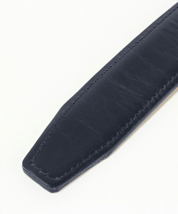 余計な装飾がないミニマルなルックスに加え、2.9cmと太すぎず・細すぎず絶妙なベルト幅。バックルは小ぶりでやや丸みのあるシルバーカラーのスクエアバックルを選び、スーツスタイルとの相性を高めています。ベルトの裏面にはナチュラルレザーを貼り合わせているため、ベルトの滑りが良く、スムーズに着脱が可能。見えない部分にも手を抜かないグレンロイヤルらしいこだわりが詰まったアイテムです。