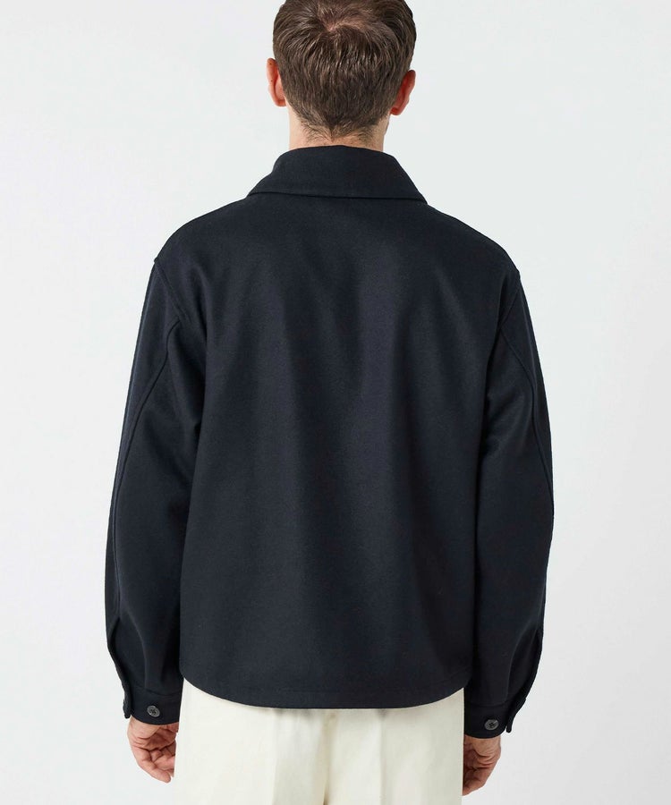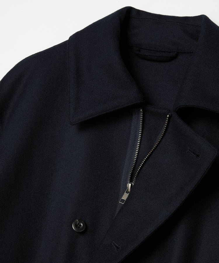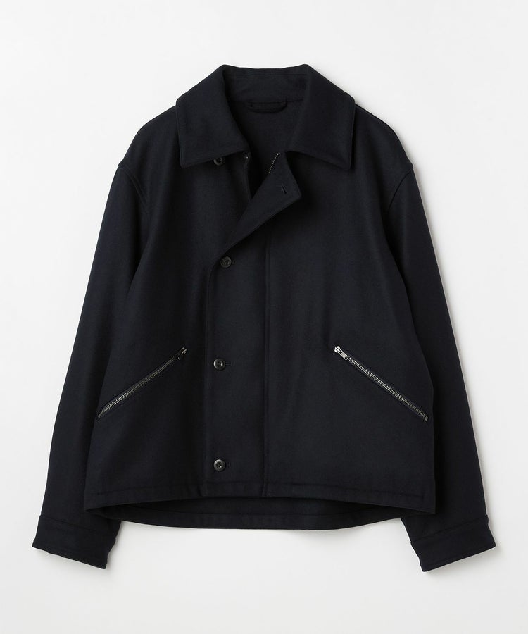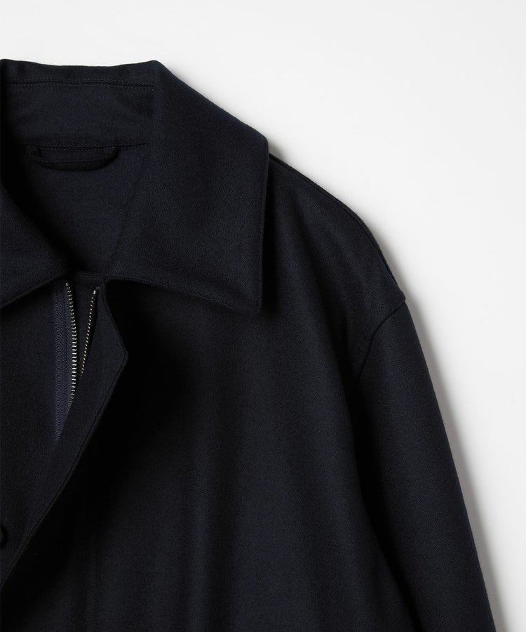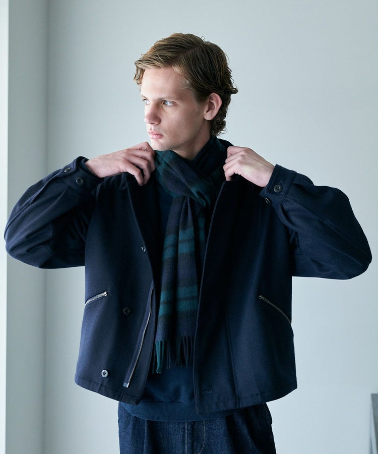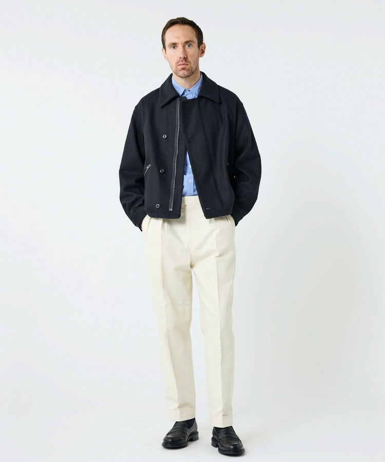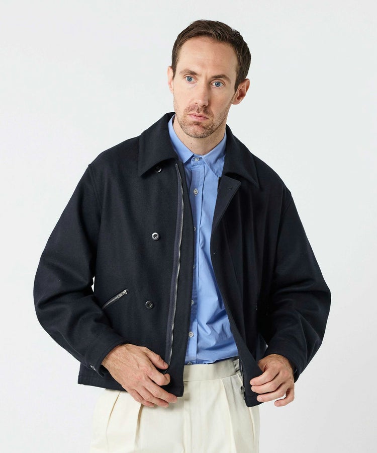 ゆったりとした身幅と短めの着丈が程よく今っぽい雰囲気になっています。また、大きめの襟とボタン位置が中心から少しずれるアシンメトリーなデザインといった特徴的なディティールは活かしつつも、現代の生活で不必要なディティールはそぎ落とし、ミニマルな印象で日常で大人が着られるフライトジャケットに昇華。ハの字スラッシュジップポケットは、アクセスしやすい位置に変更するなど、実用性も高めています。さらに芯地の厚さやステッチの位置、運針といった細かい部分までこだわり、カジュアルなライトアウターという側面を持ちつつも上品な香りがするアイテムに仕上がっています。