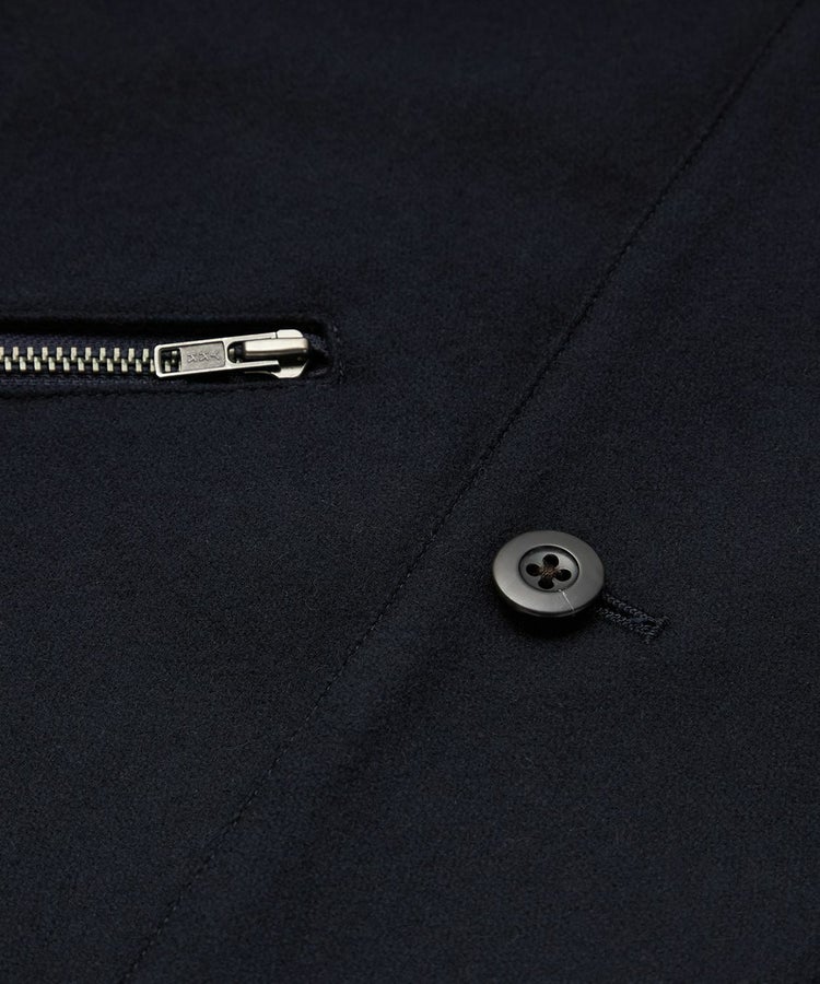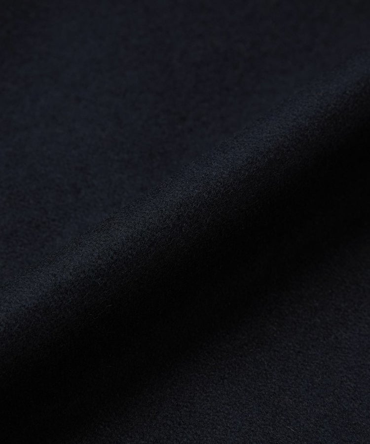 Super100Sの良質原料を使用しており、尾州にて丁寧に織られ縮絨を数回繰り返し、表面の毛羽を綺麗にカットしている上、とても上品なメルトンを使用しています。