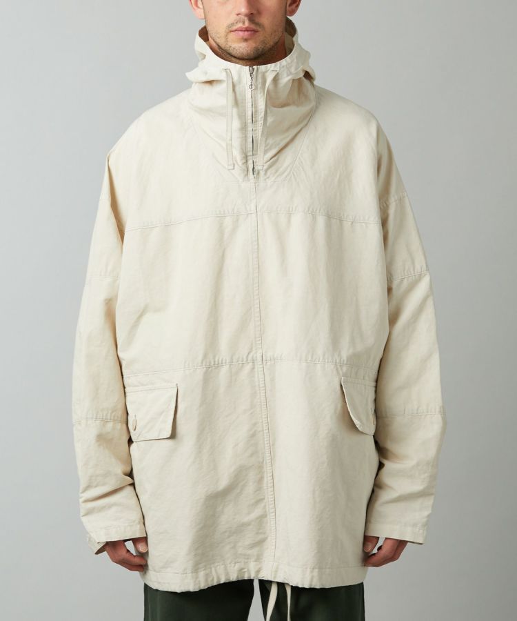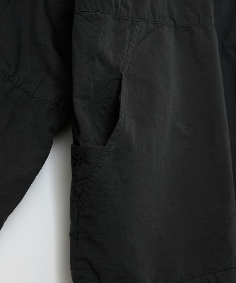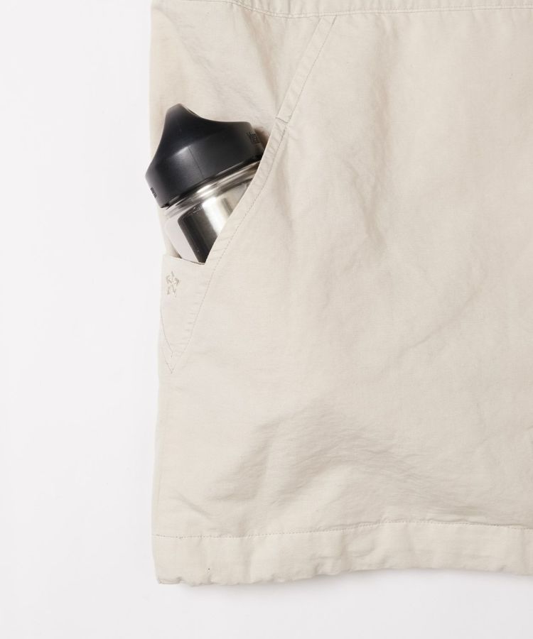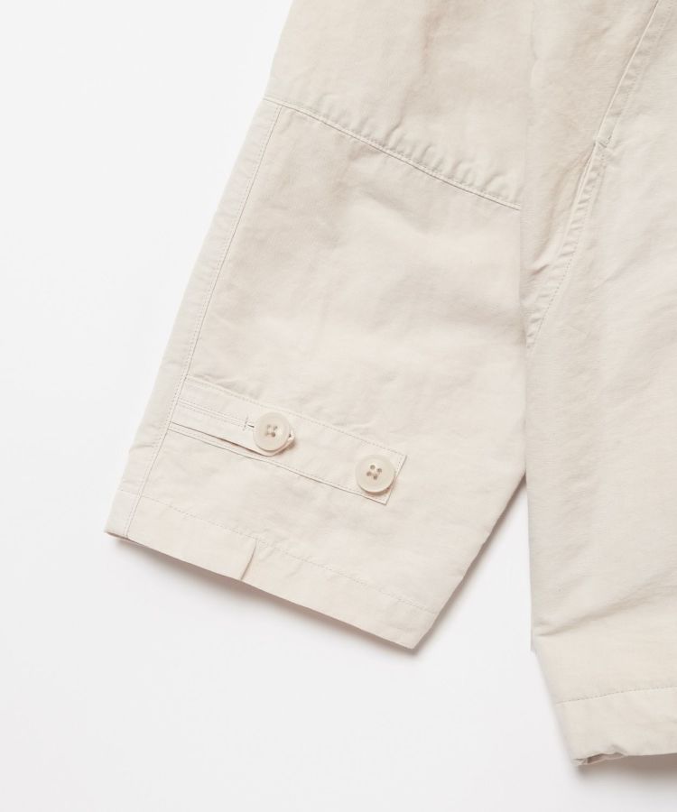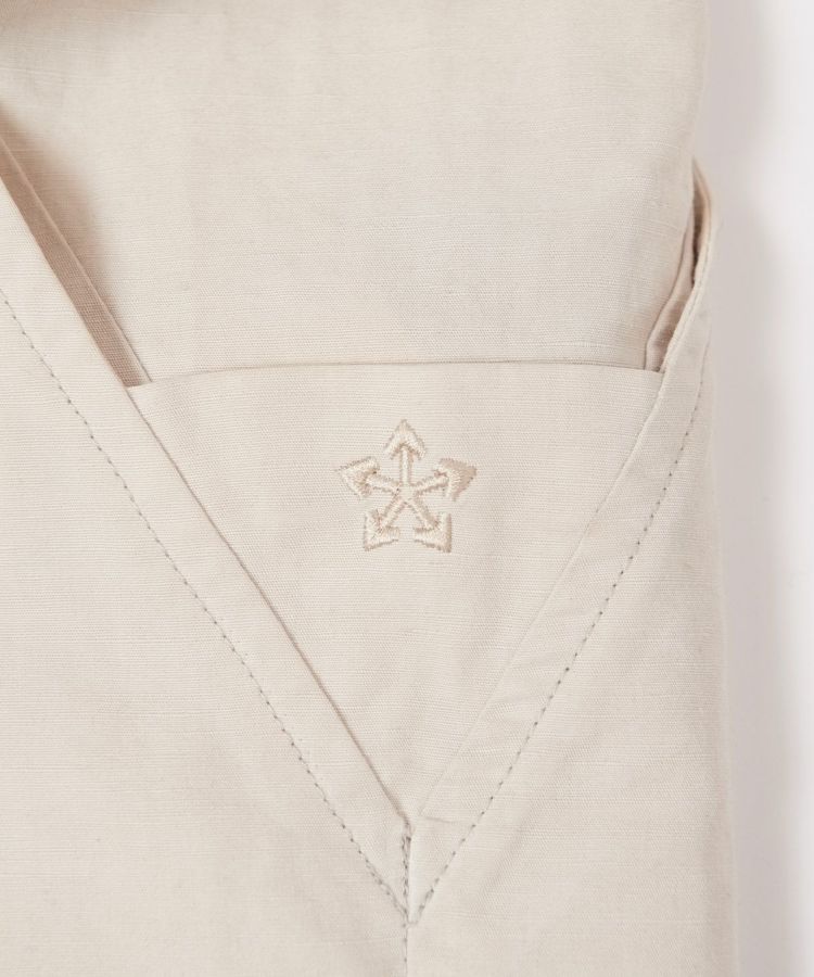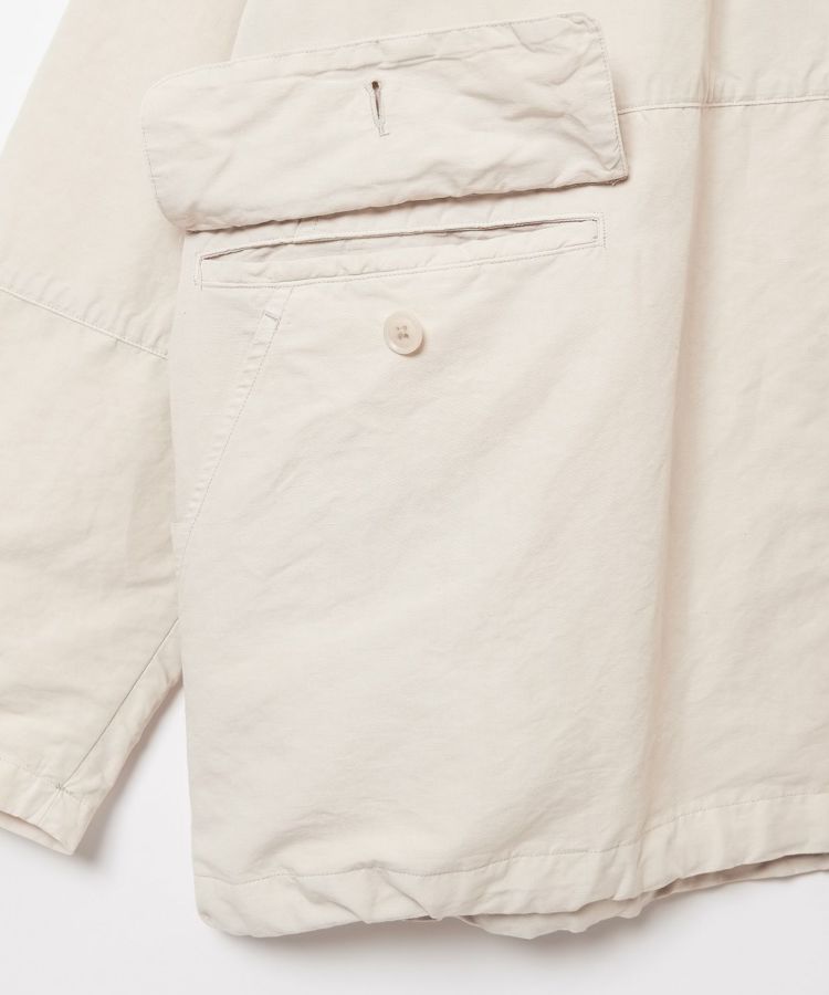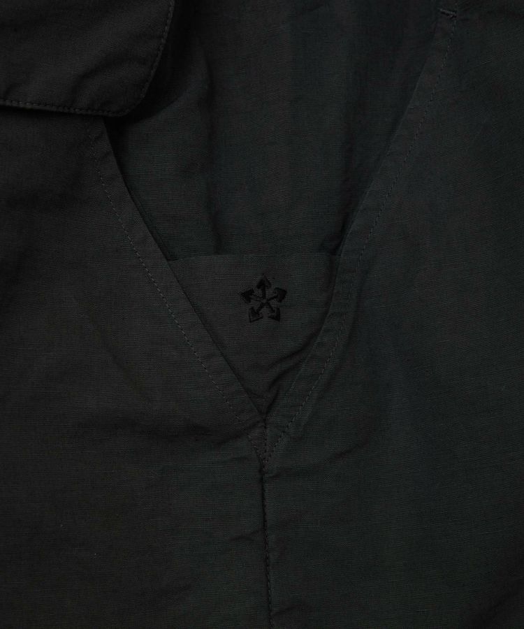 生地は製品染めを施し独特な風合いに仕上げた、ドライタッチで速乾性のある綿麻ウェザー。リネンをブレンドしていることで耐久性が増すとともに、ナチュラルな爽やかさを演出しています。自然なシワ感が絶妙に入っているので、アウトドアでもタウンユースでも「使える」素材感。清涼感とシャリ感があるため肌離れがよく、サラっとした着心地が気持ちの良いアイテムです。