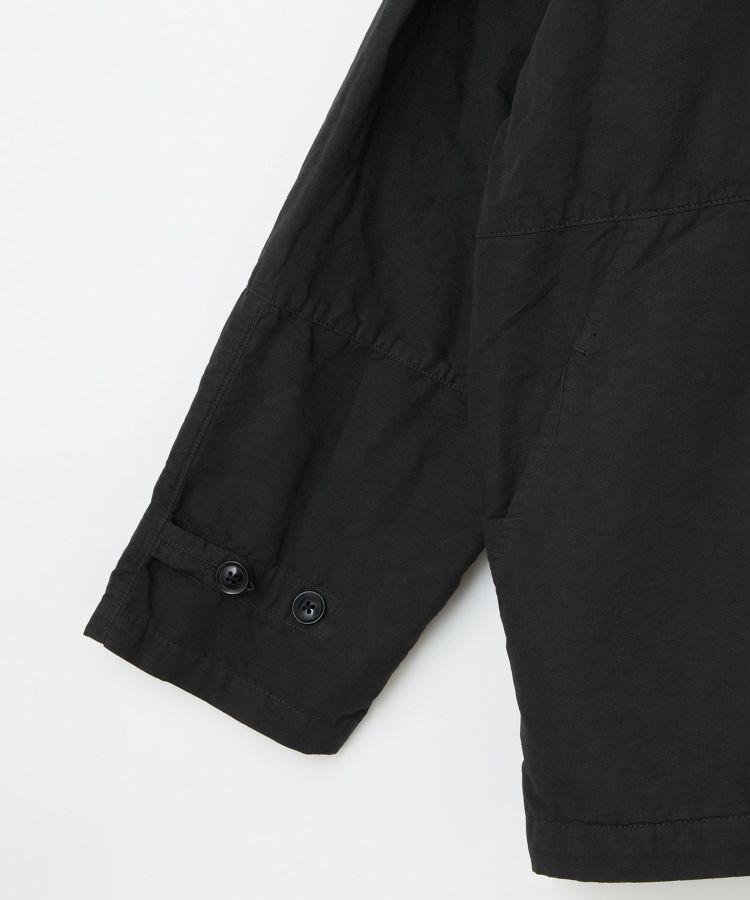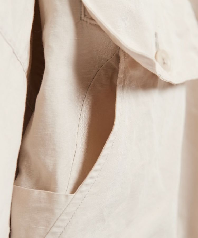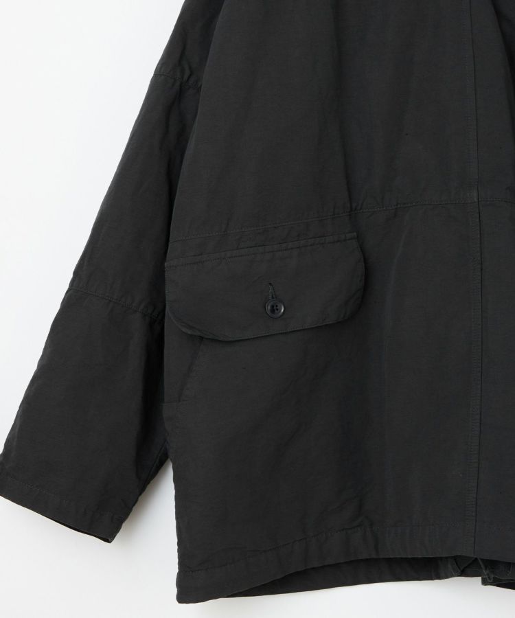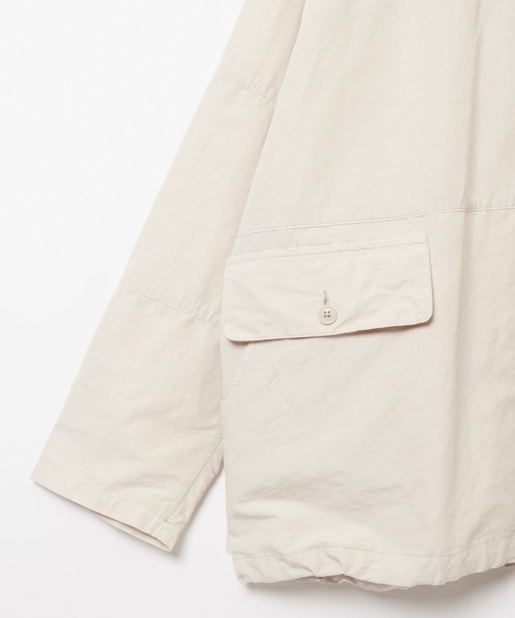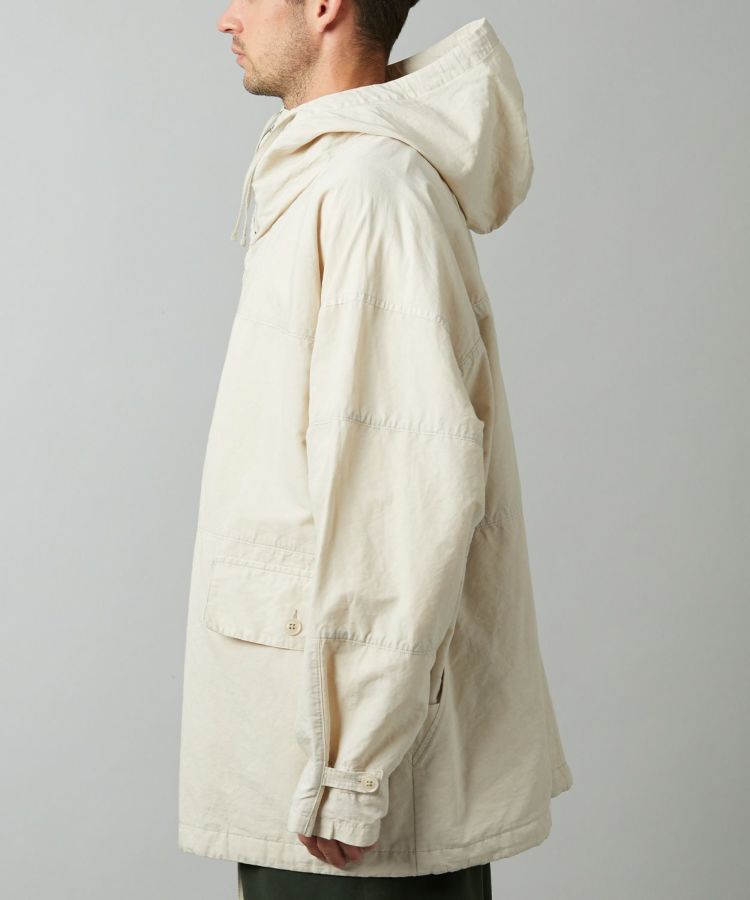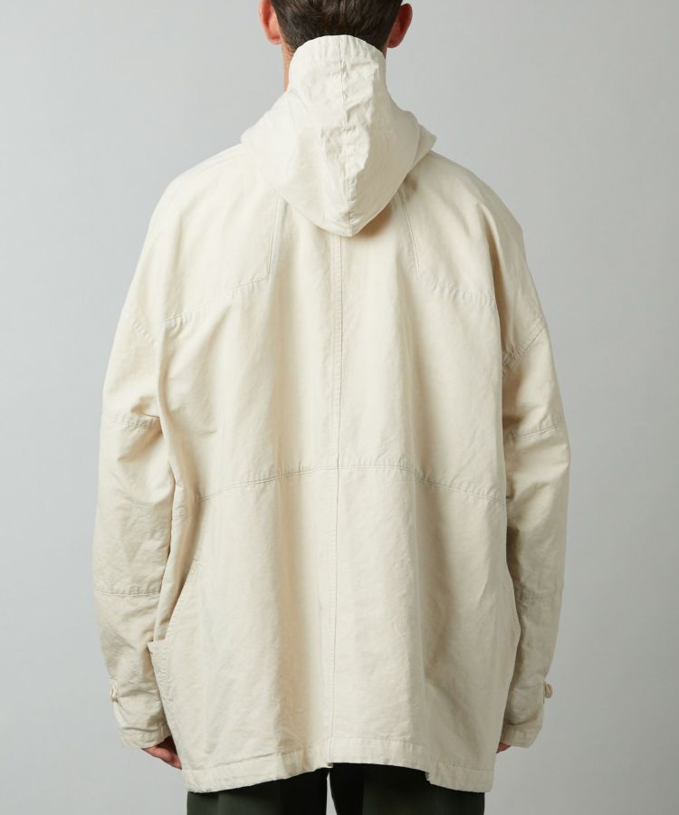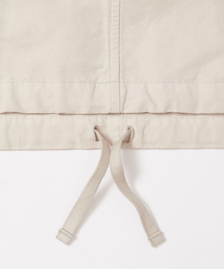 生地は製品染めを施し独特な風合いに仕上げた、ドライタッチで速乾性のある綿麻ウェザー。リネンをブレンドしていることで耐久性が増すとともに、ナチュラルな爽やかさを演出しています。自然なシワ感が絶妙に入っているので、アウトドアでもタウンユースでも「使える」素材感。清涼感とシャリ感があるため肌離れがよく、サラっとした着心地が気持ちの良いアイテムです。