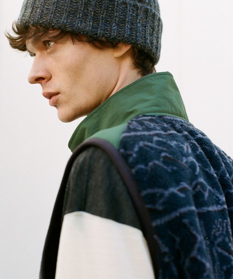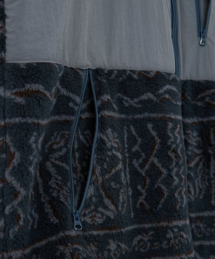 ジャカード織機で織り上げたオリジナル柄のボアを使用し、90年代のオールドスポーツウェアをベースにバルーンシルエットにしています。冷気に対する首の保温性を高めるため、襟を若干高めに仕上げている作りです。