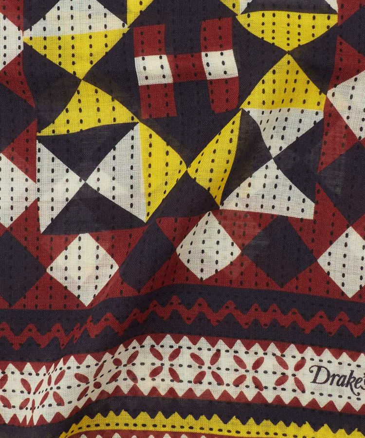 パッチワークのように組み合わされた幾何学模様が印象的な、クラシックとモダンが融合したウールシルクスカーフ。