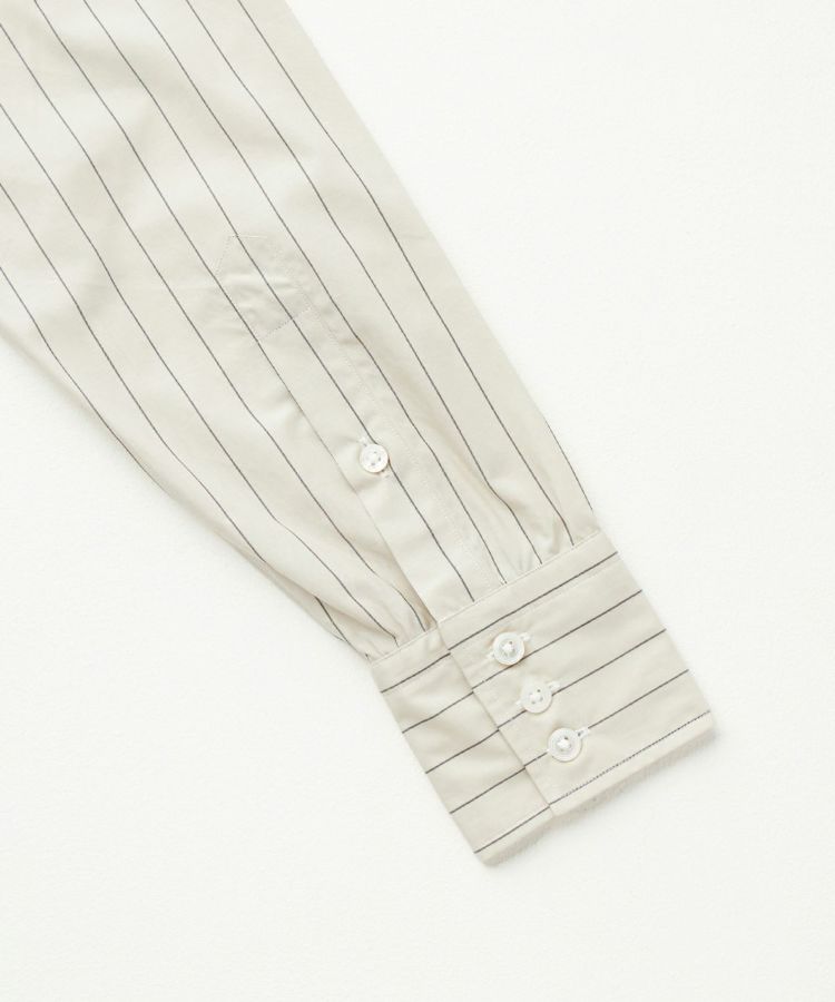 一般的なタイプライター生地の仕様や特徴と合わせつつ、60番手単糸と120番手双糸の交織による、上質で軽やかかつしなやかな高密度織りのコットン素材。細番手の組み合わせにより、薄く軽やかですが、高密度で型崩れしにくい特徴も持ち合わせています。ナチュラルな柔らかさと上品な光沢があり、サラリとした優しい風合いです。