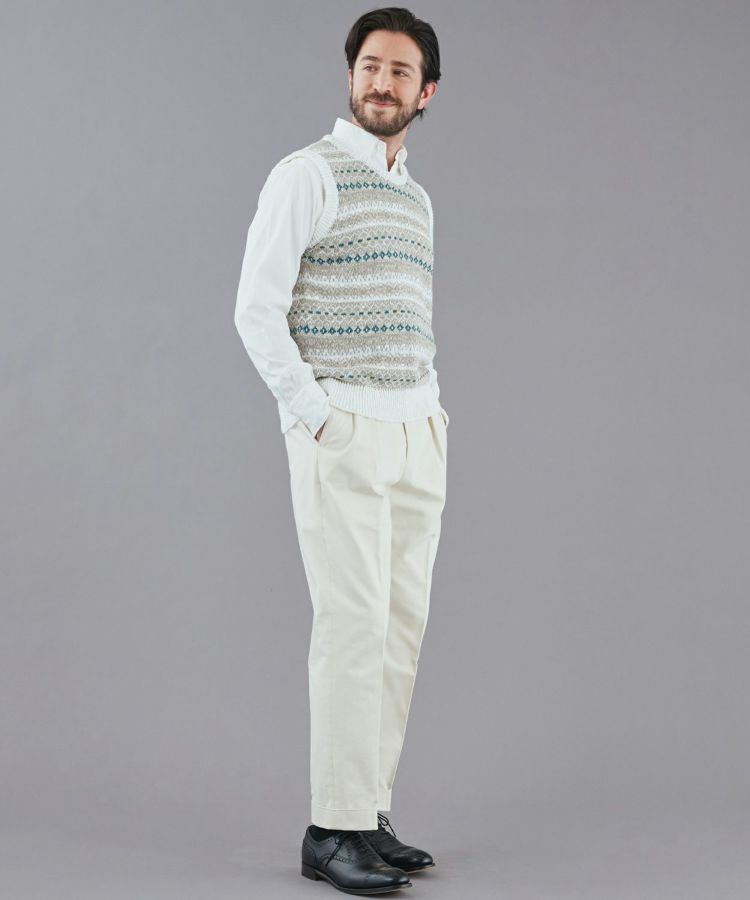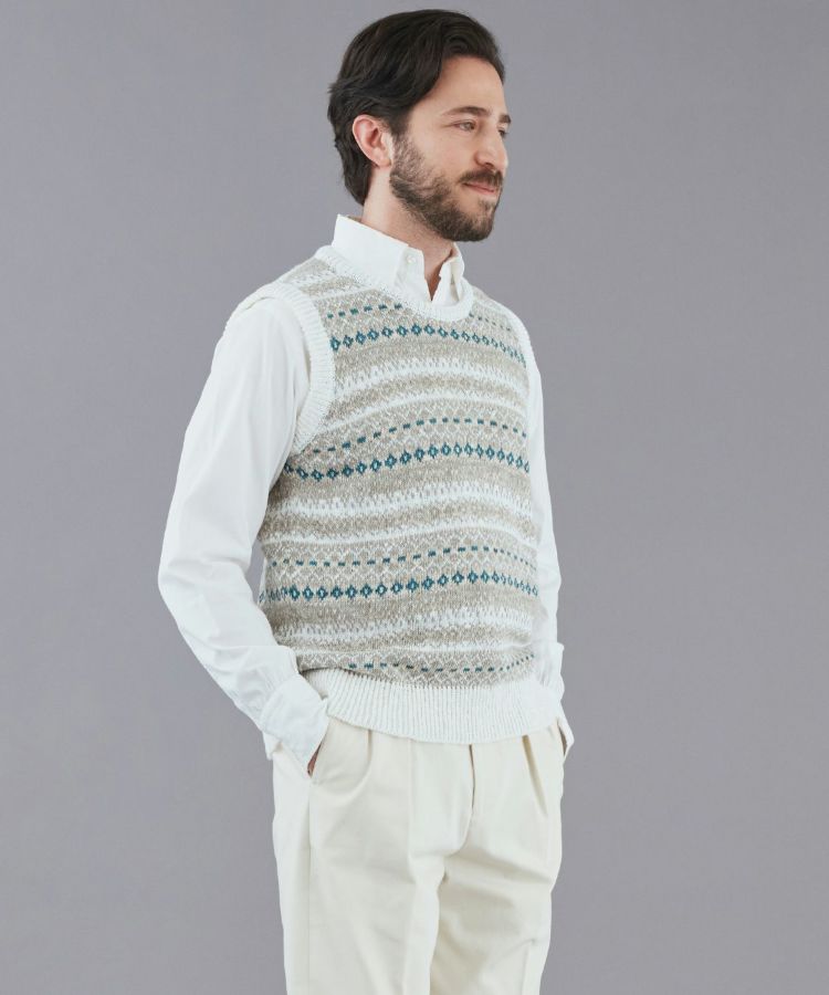 スコットランド発祥のクラシックなパターン、フェアアイルを取り入れた、英国らしいカントリースタイルのニットベストです。