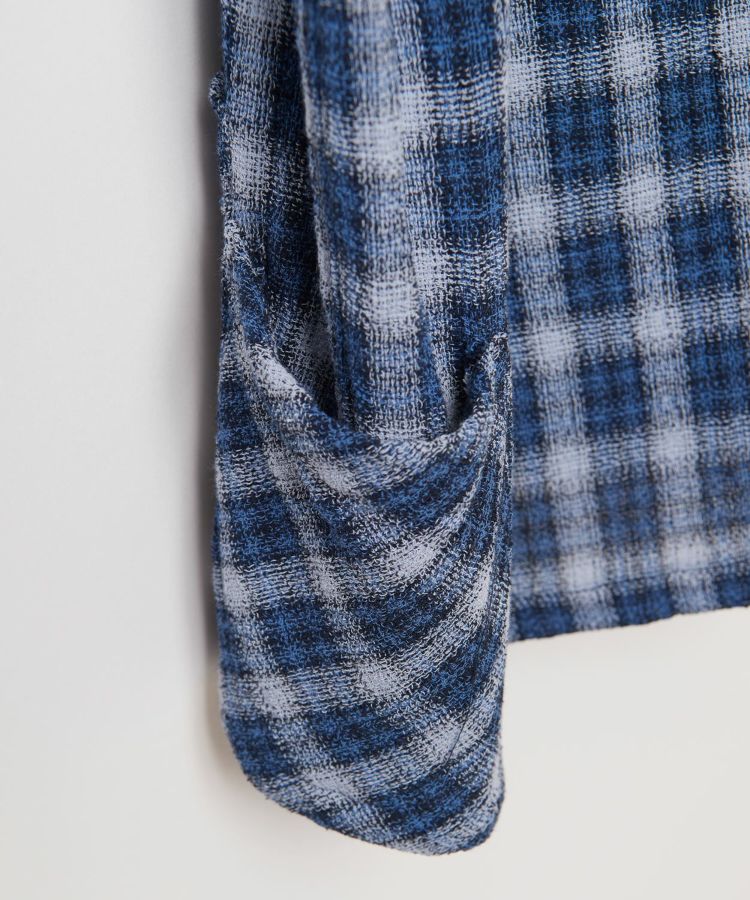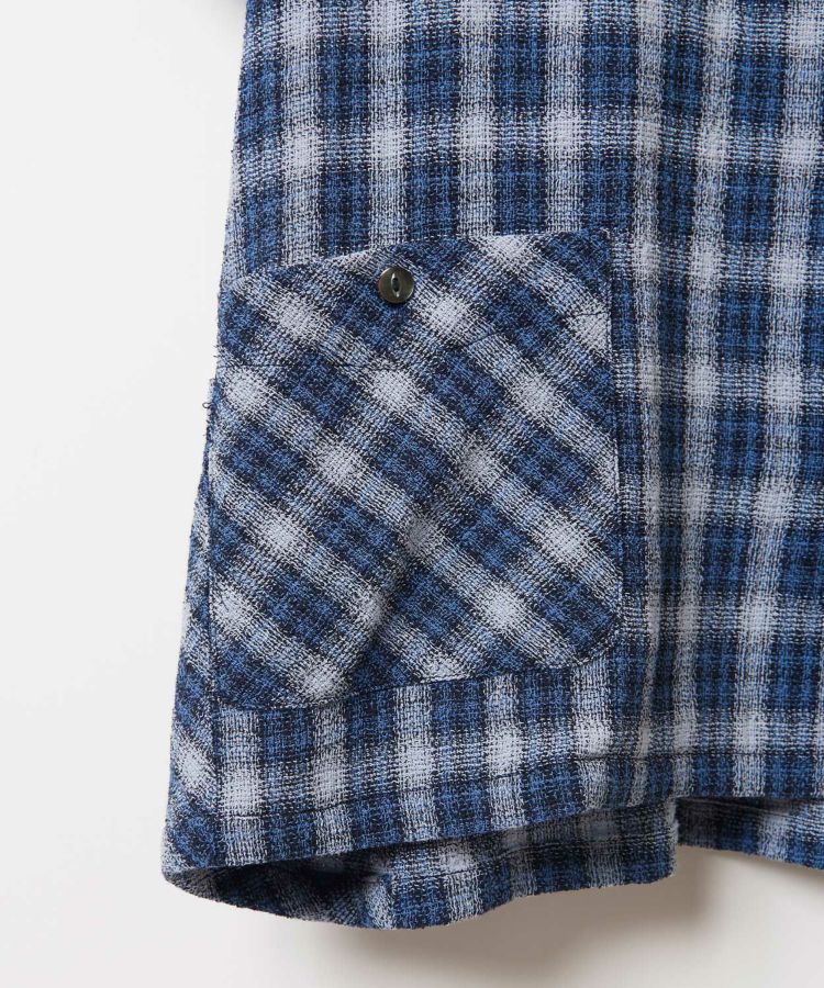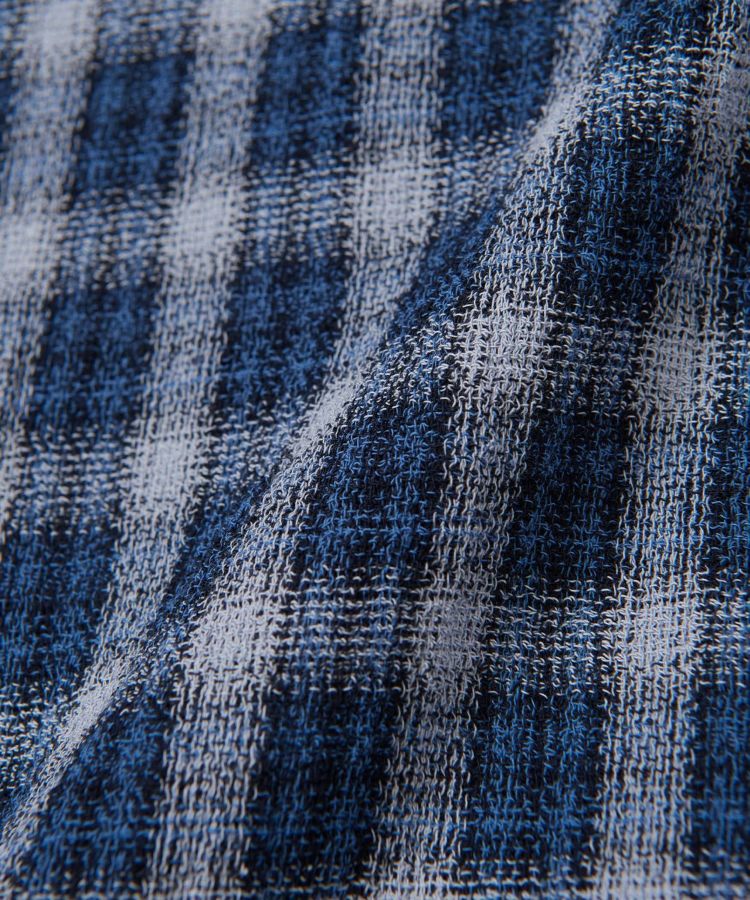 素材は強撚糸のコットンを使用したパナマクロスをオリジナルで製作。希少なマシンを使い、糸が切れないようにゆっくりと時間をかけて織るからこそ生まれる、独特な風合いをもつ生地に仕上がっています。度詰めになりすぎない若干のゆるさが、ユニークなしっとり感を作り出してくれています。