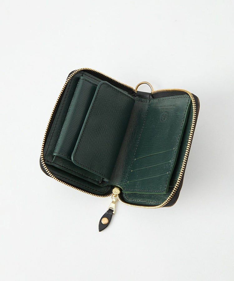 クレジットカードほどのサイズ感で、財布を開くと内側にはカード収納やマチ付きのコインケース、さらには仕切り付きの札入れがある為、見た目以上に充実した収納力を備えています。背面外側にもカードポケットがある事で使用頻度が高いICカードなどを収納でき、財布を開かなくてもカードの出し入れが可能です。ウォレットコードやタッセル、キーホルダーなどを付けることができるDリングを搭載しているので、独自のアレンジもお勧めです。