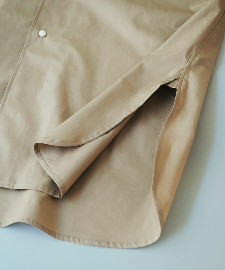 年代によってディテールが異なるイギリスのポリスオフィサーシャツですが、特に人気があり希少価値が高いといわれているのが1960年代のもの。当時は、生地にサックスブルーの刷毛目(はけめ)が使われ、襟はバンドカラー、プルオーバータイプのシャツでした。この原型をもとに、メンズらしさは残しつつも、丈とアームホールのパターンを調整することで女性らしくも着ることができるシャツワンピースが完成しました。生地にはシルキーな肌触りの超長綿を採用し、丁寧なステッチワークを得意とする国内工場で生産するなど、細部にまでこだわった上質な一着です。