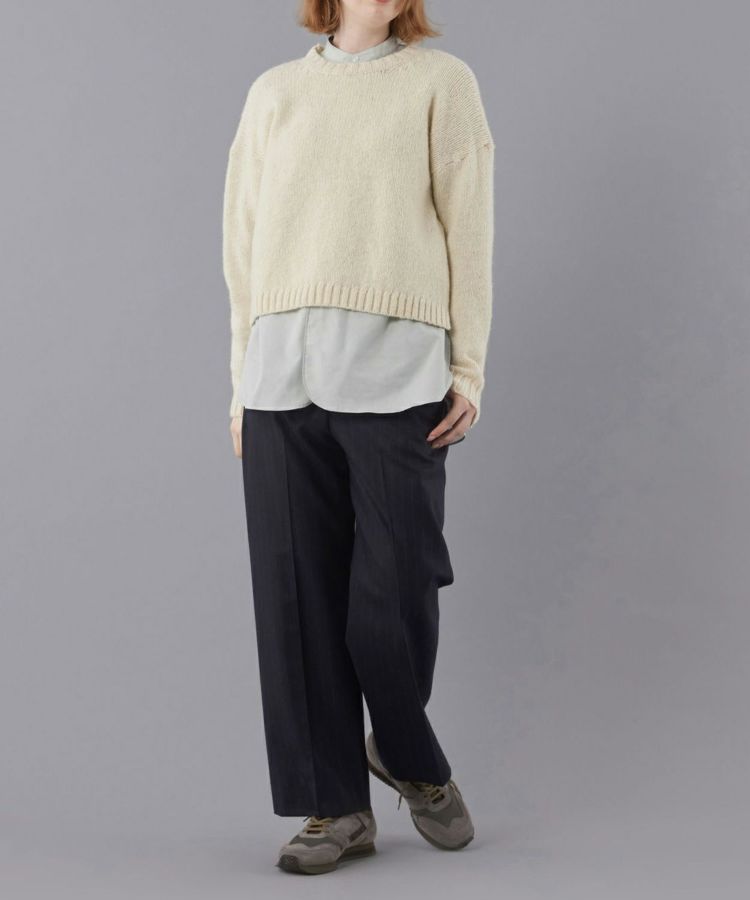 1960年代の魅力的でファッショナブルな時代の英国オフィサーシャツがベースになっています。年代によって形に差がありますが、採用したデザインはフルオープンタイプ。当時のクラシカルなディテール、フロントの前立て終わりからの大きく膨らむようにラウンドする特徴的なフロントカットがアクセントに。比翼仕様になっているので羽織のように着こなすこともできます。カフスは本来ダブルですが、アレンジしても着られるように当時のデザイン要素を残し、現代的な着こなしができるようにシングルカフスを長めに設定。これによりターンナップカフスとしても楽しめるようになっています。袖丈は少し長めに設定してありますが、折り返すことでジャストに着ることを想定。また袖口とヨークはタック仕様ではなくギャザーにアレンジしており、よりエレガントに見せたいという想いが加えられています。
