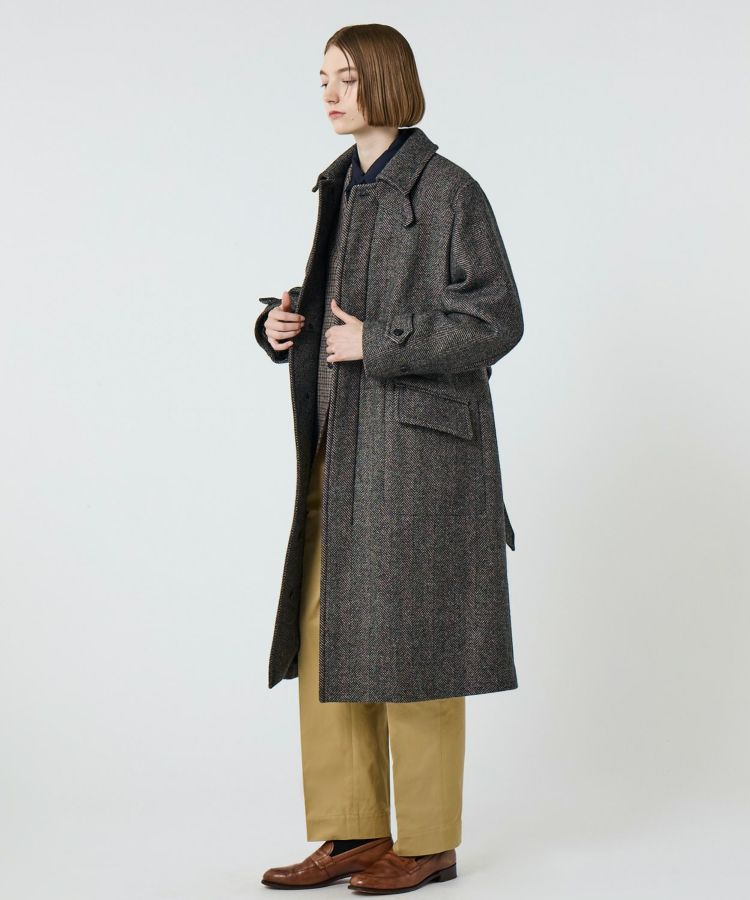 毛織物の産地、尾州で織られた国産生地です。大きめのへリンボ-ン織りがクラシカルな生地です。しっかりと織り上げた生地は、保温性に優れながらも軽やかな着心地。冬の冷たい空気を和らげつつ、洗練されたムードを演出します。