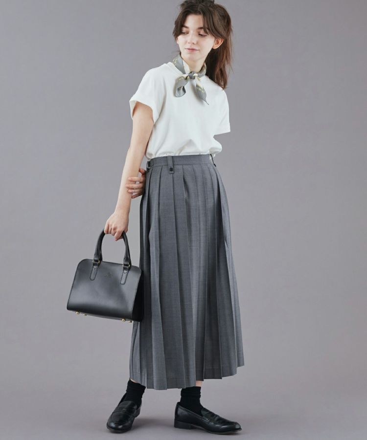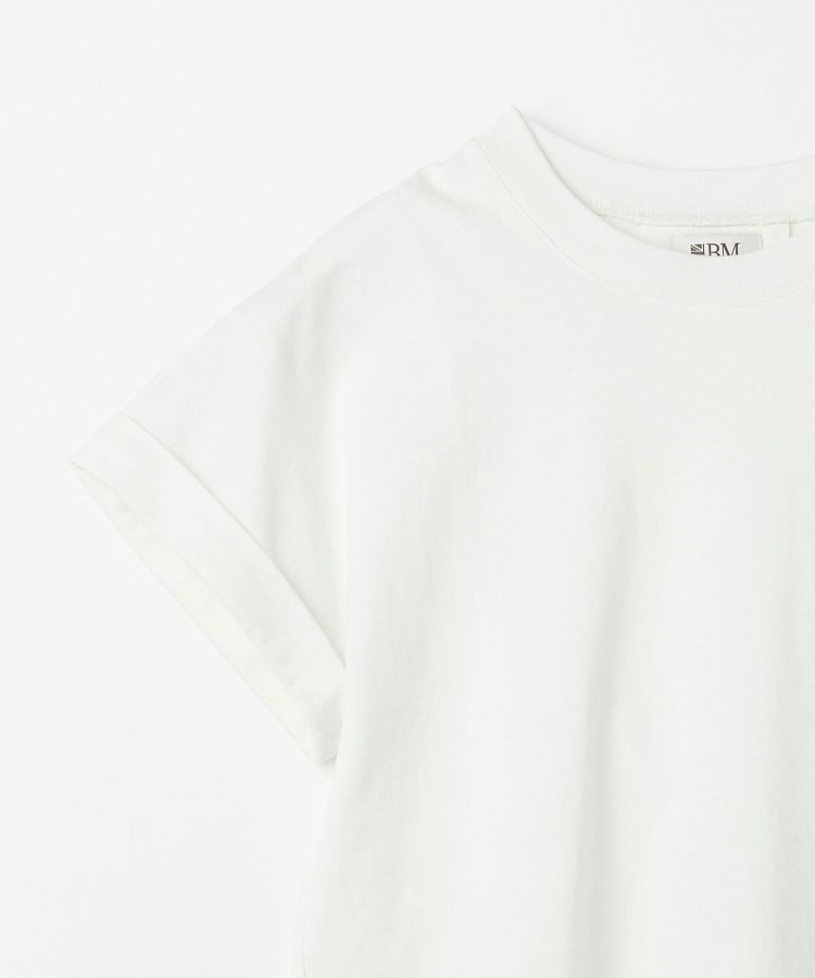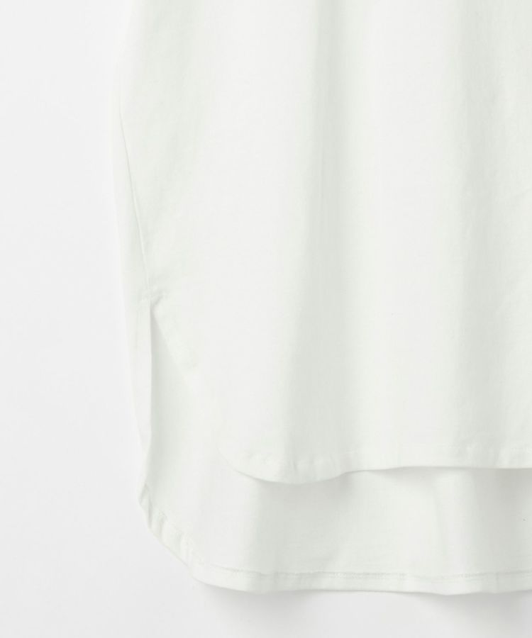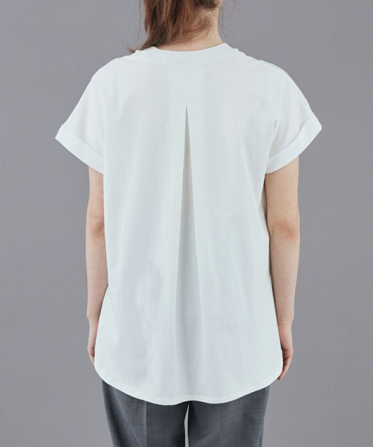 袖口の折り返しと後ろのタックデザインが効いており、一枚でコーディネートがまとまります。春夏はもちろん、インナーとしてレイヤードにも活躍してくれるので一年中使える万能アイテムです。タックインしやすいように、裾はラウンドでサイドにスリットが入っており、ボトムスとも相性がよく、フロントのみタックインしたり、タックアウトしてパンツやスカートに合わせることができます。シンプルながら、ディティールにこだわったデザインと、シルエットが魅力なTシャツは、ジャケットの下やカジュアルスタイルまで幅広く対応が出来ます。フレンチスリーブのような袖口は、さりげなく二の腕をカバーしてくれます。生地は適度な厚みがありながらも柔らかく、着心地の良いコットン100%素材です。