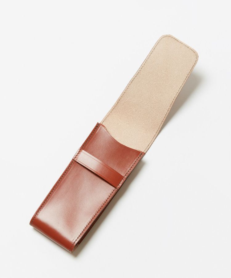金具を使用せずフラップを差し込んで止めるシンプルな仕様。飽きの来ないデザインでなつかしさを感じさせる大人の為のステーショナリーです。何気ないビジネスシーンでも佇まいを美しく感じさせてくれるアイテムは、自分らしいこだわりで長く愛用していただけます。必要最低限のペン類が収まるコンパクトなサイズ感ながらも、2.5cmのマチがありメガネをすっきりと持ち歩けます。