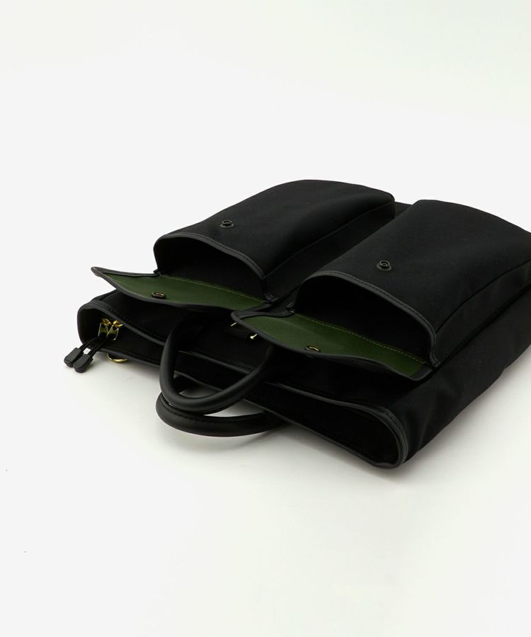 素材は撥水コーティングを施した、張りのある混合素材を表地に採用。裏地との間にラバーフィルムをボンディングし、水が中まで染み込まずバッグの中身が濡れるのを防いでくれます。上部は止水ジップを使用しており、さらに防水性を高めたデザイン。取り外し可能なショルダーストラップ付きで、2WAYでの使用が可能。ストラップは長さ調節ができ、機能面にも優れています。
