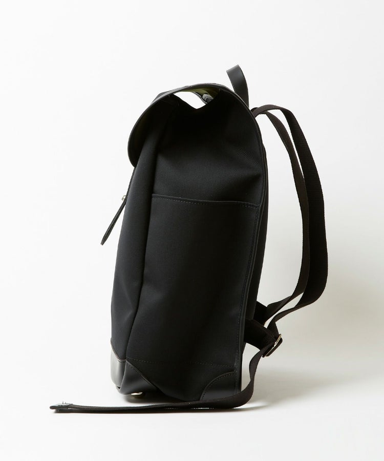 レザー部分には贅沢にブライドルレザーを使用。フロントのフラップベルトはギボシ仕様にすることで開閉しやすく、収納量によって調整が可能です。ショルダーストラップは長さ調整ができ、両サイドのポケットにはスマートフォンや水筒などを収納できます。内側には背面の壁に沿うようにポケットが設けられ、細部にまでこだわりが詰まったアイテムに仕上がっています。