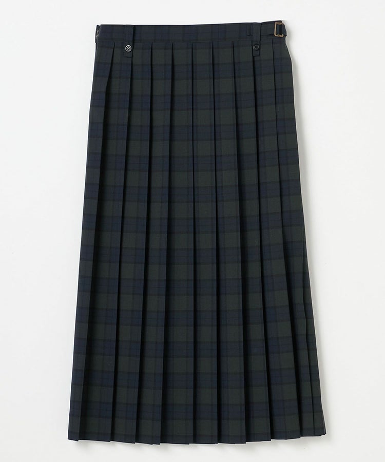 右脇に尾錠が付いたデザインで、ベルトをせずに履くことも可能です。総プリーツで綺麗めにもカジュアルにも幅広くお使いいただける大人の為のスカートです。