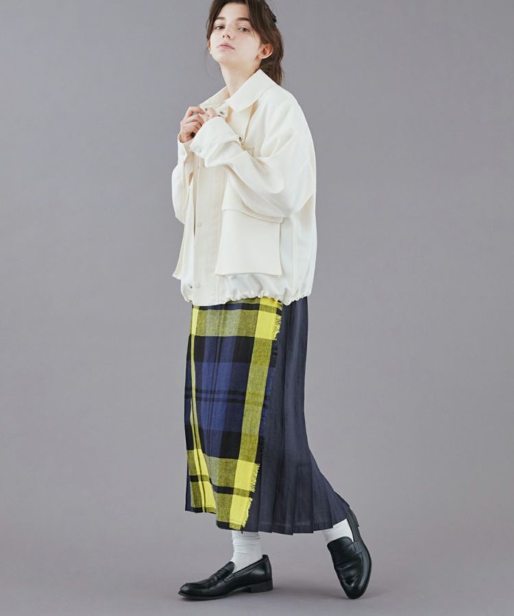 軽やかで涼しげなリネン素材をベースに、フロントパネルデザインはフリンジがアクセント。歩くたびに揺れるバックプリーツとタックインした時アクセントになるウエストベルト、サイドに施された3つのレザーベルトがコーディネートを引き締めます。バックウエストにはゴムが施されているためストレスフリーな着心地。シンプルなトップスを合わせることで、キルトスカートの魅力がより引き立ちます。