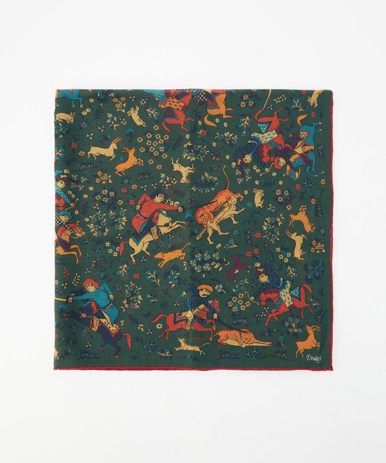 動物や騎馬民族のハンターの柄は個性的ながらも色鮮やかで上品な印象。ドレイクスらしさが光るアイテムです。生地にはピュアウールとシルクを使用し、薄手でふんわりと優しい肌触り。ジャケットやニットに合わせたり、巻き方次第でスタイリングにバリエーションを与えてくれる万能アイテムです。