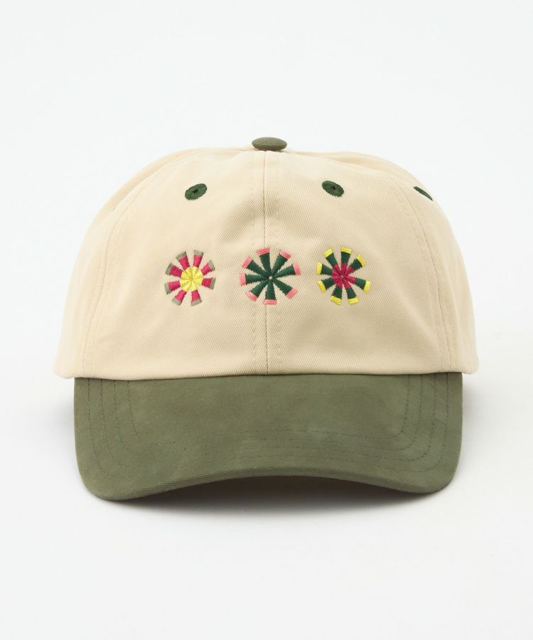 伝統的なカンタ技法を用いて施された、太陽の刺繍が特徴的なデザイン。ヨークシャー産の丈夫なコットン素材を使用し、柔らかなクラウンと緩やかなカーブを描くつばが特徴。かつてのスポーツウェアを彷彿させるリラックスしたシルエットが魅力。バックにはアジャスターがついており、サイズ調節可能です。