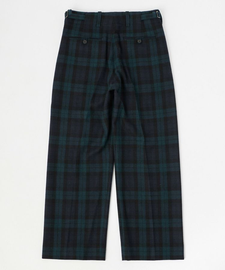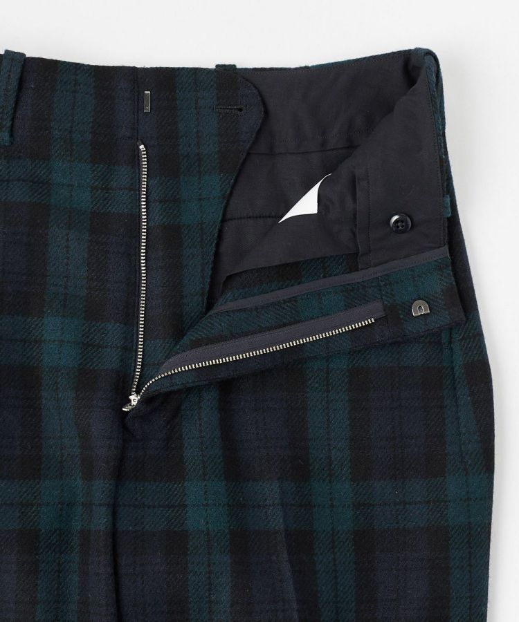 イメージソースとしたのは、ロイヤルスコットランド連隊がセレモニー(式典)の際に着用するセレモニーパンツ。デザインの特徴でもあるサイドシームレスを採用。サイドに縫い代がないため、サイドラインをきれいに見せることができます。手の込んだ丁寧な仕様のため、限られた国内工場で生産するなど、細部にまでこだわった上質な一着です。股上を深めにすることで、ヒップラインを拾いづらく足長効果も。ウエストはサイドアジャスターでサイズ調整が可能です。